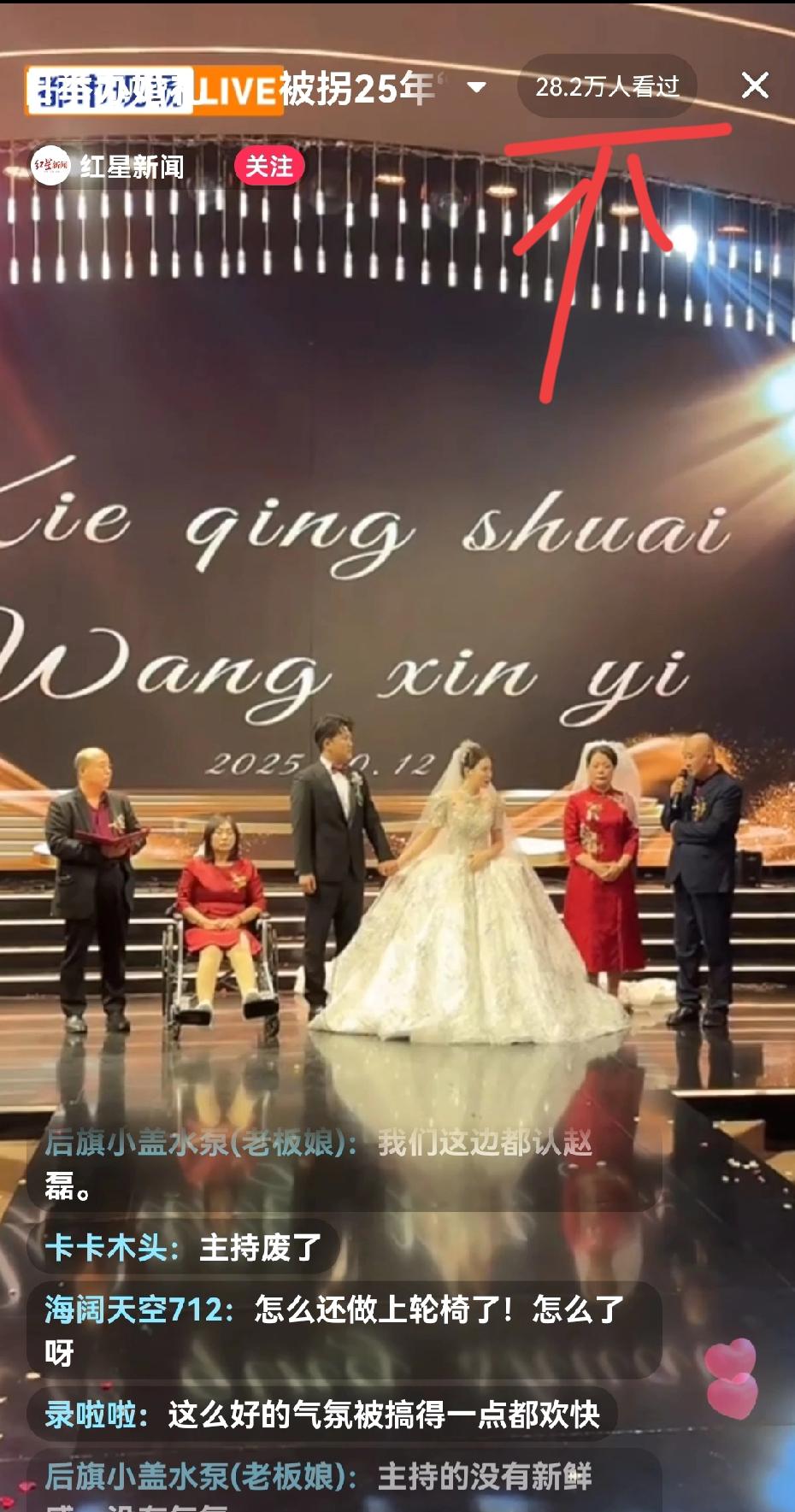 解清帅的婚礼又是惊喜满满的一天啊! 两个爸爸一上场,评论区就开了锅! 在线观众里没有看到那些熟悉的身影! 本来不知道谁说人家解家流量不行了的,只是没有合适的话题而已,人家现在是富二代了,带货只是日常工作而已。 你看这结一次婚,就有10多万人同时在线,28万多少观看婚礼现场,虽然请的主持人水平不咋地,语言组织也有点拉胯。一点不影响网友和粉丝刷礼物的热情,你们猜猜他们有没有可能靠直播间的收入,就够酒席的钱了? 还有就是杨妞花、谢岳、杜小华这些流量寻亲家庭都去了,被安排在婚礼的那里了呢,看半天没找到。这些其实都是无所谓,大家最关心的应该还是他们能给解家随多少礼金,估计解家肯定会保密的吧,因为有的人,肯定是象征性的给点,主要是要人家的流量。 还有就是网友比较关心的,杜小华今天有没化牌子?有看到的吗? 最有意思的还是两个爸爸一上台,很多网友都打出来两个光头,是这么的默契十足,如果不是他们孩子结婚,估计他们就是全场最亮的崽! 在婚礼现场你们还看到寻亲家庭的谁了吗?