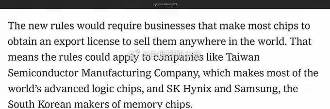10月11日《纽约时报》: 中国的新规定将要求大多数芯片制造商若要向全球市场出口产品,必须先获得出口许可证。这意味着全球主要先进逻辑芯片制造商台积电以及韩国的存储芯片制造商SK海力士和三星等企业均需遵守此规。台积电要向美国出货14纳米以下的芯片,必须得到中国商务部的批准,如果拒绝,那中国就断供所有稀土和超硬材料等芯片制造必需品,掐死不太可能,但把台积电产能压缩10%完全办得到!