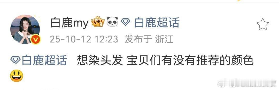 白鹿想染头发 白鹿想染头发了,在线让粉丝宝贝们推荐颜色😃美女表现力那么好,怎么都好看,期待新发色~[期待]