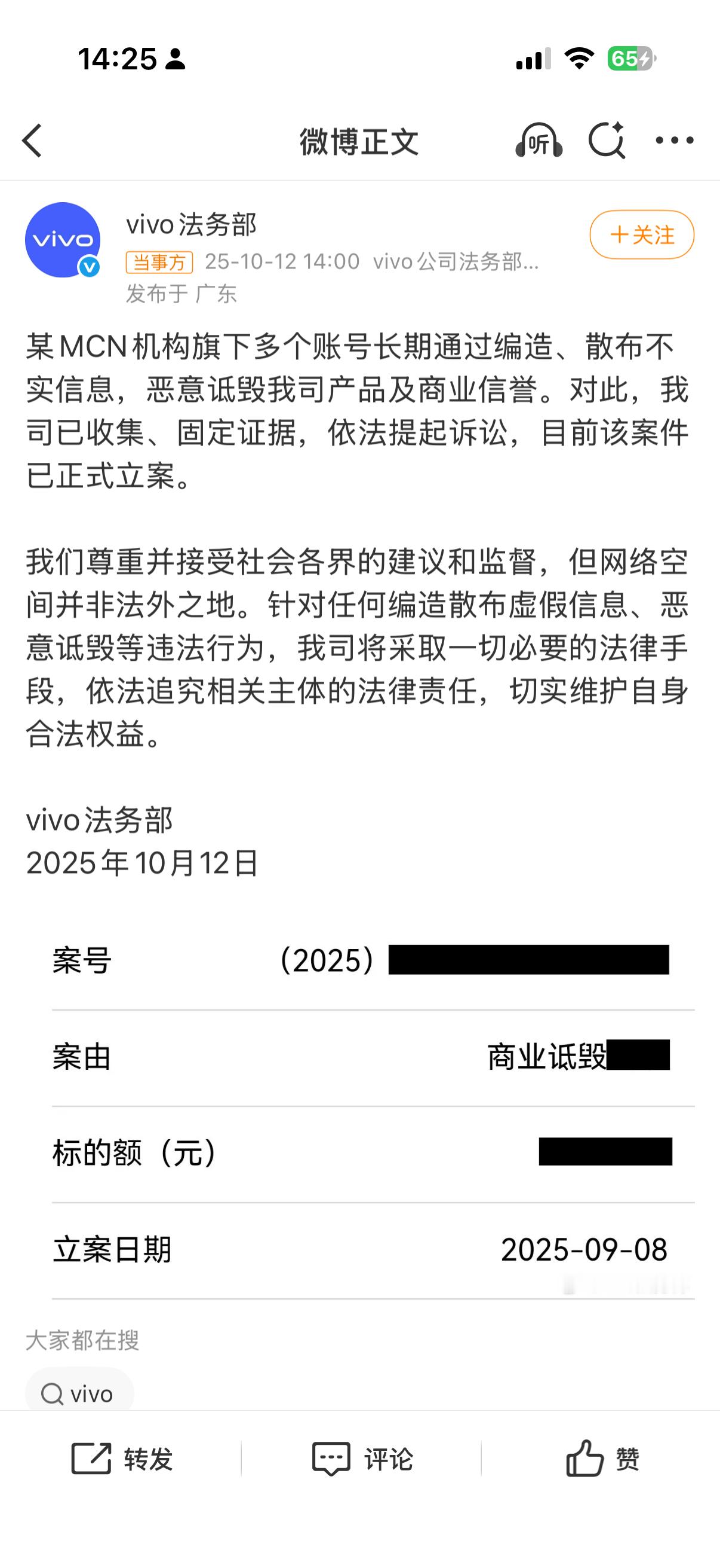 vivo起诉某MCN诋毁索赔近千万 蓝厂也是硬起来了,想知道是哪个MCN?