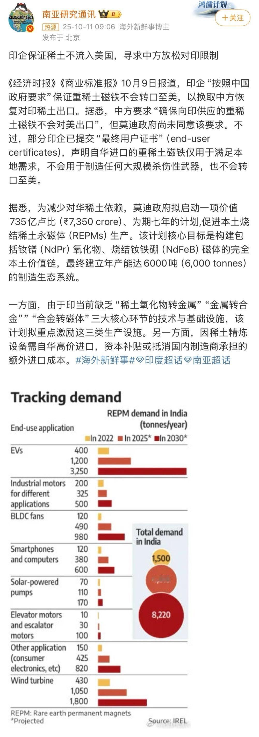 印企保证稀土不流入美国,寻求中方放松对印限制! 为了换取中方恢复对印稀土出口,印企忙写保证书,保证重稀土磁铁不会转口到美国。 不过,莫迪政府尚未同意该要求。 笑死,三哥的保证可信吗? 信不信由你,反正我是不信,连一个标点符号都不信。