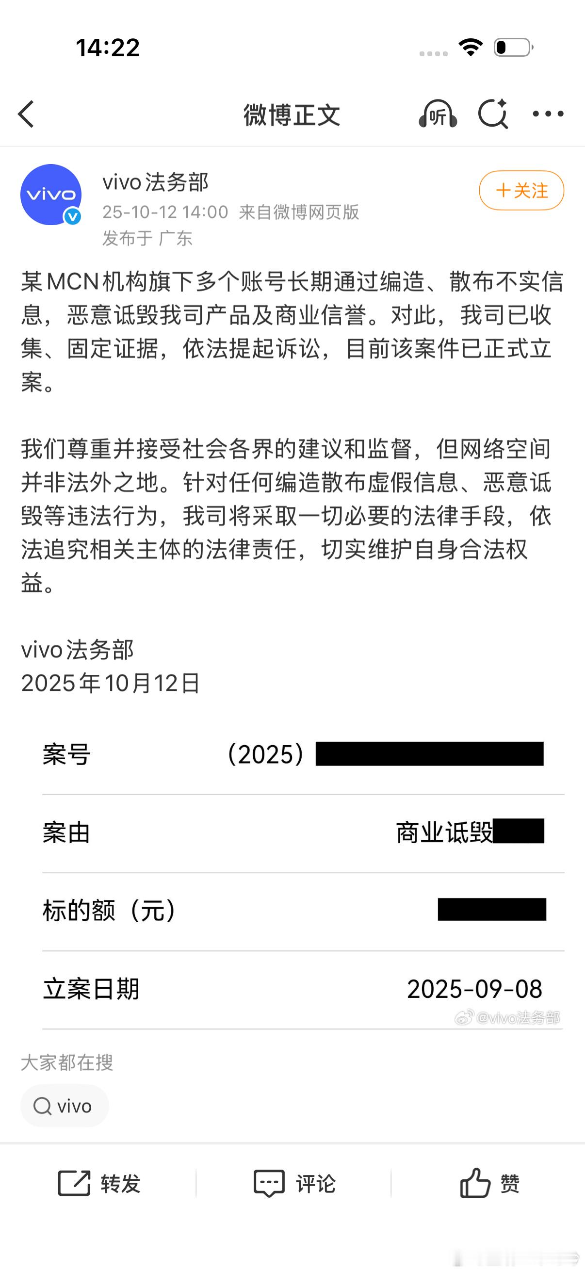 vivo起诉某MCN诋毁索赔近千万 某S开头的MCN么?[并不简单]