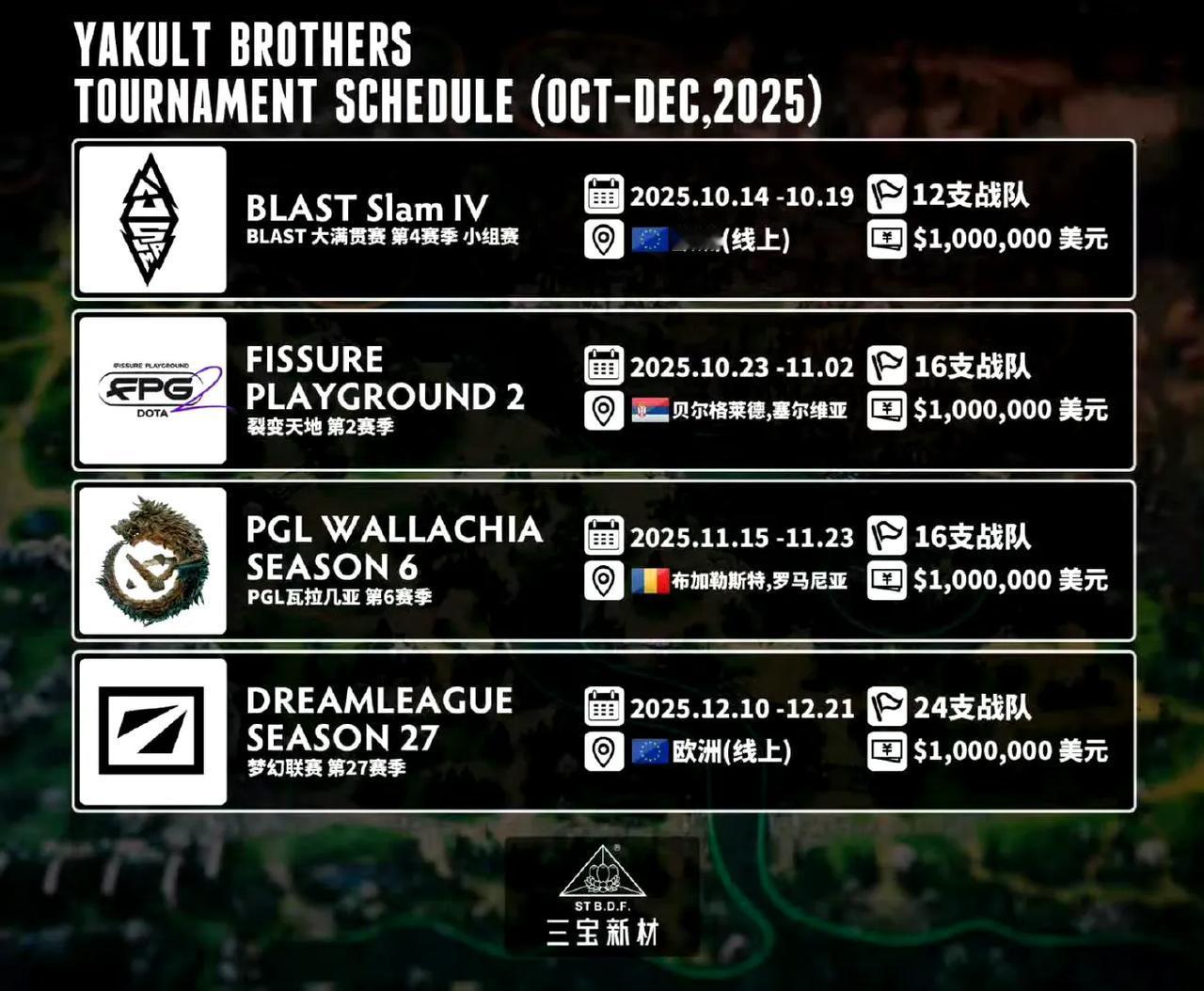 DOTA2: YB战队获得赞助,并且出国参加比赛 目前YB已经拉到了赞助,是一家叫三宝新材的公司,据说老板是刀塔的粉丝,所以就赞助了YB兄弟,目前YB还是原班人马出战,之前传言波波卡找到了队伍,后面又说不去了。 目前要去欧洲参加四个比赛,三个是预选赛入围的,一个是直邀,从10月打到12月。 10.14-10.19 BLAST 新加坡站 小组赛 10.23-11.02 裂变天地S2 11.15-11.23 PGL S6 12.10-12.21 梦幻联赛S27