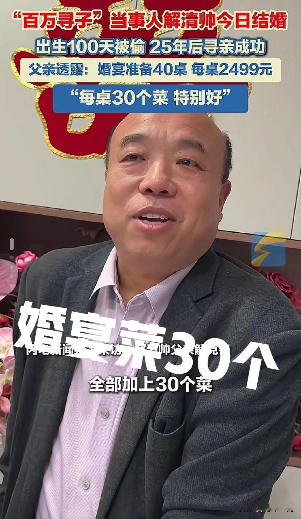 解清帅婚宴2499元一桌。儿子结婚,解清帅爸爸在台上可真是哭的稀里哗啦啊,真情流露,老父亲忍不住啊。老父亲为儿子这次的婚礼卯足了劲,操碎了心。 这次的婚宴预备的大桌18人一桌,每桌30个菜,2499元。 平时在外面吃饭,人多要个大桌,但是在婚宴上还真没见过18人一桌的,见过的都是十人一桌的,又孤陋寡闻了。 这样算下来,按十个人一桌是1388元。这在邢台当地算是比较高档的酒席吗?
