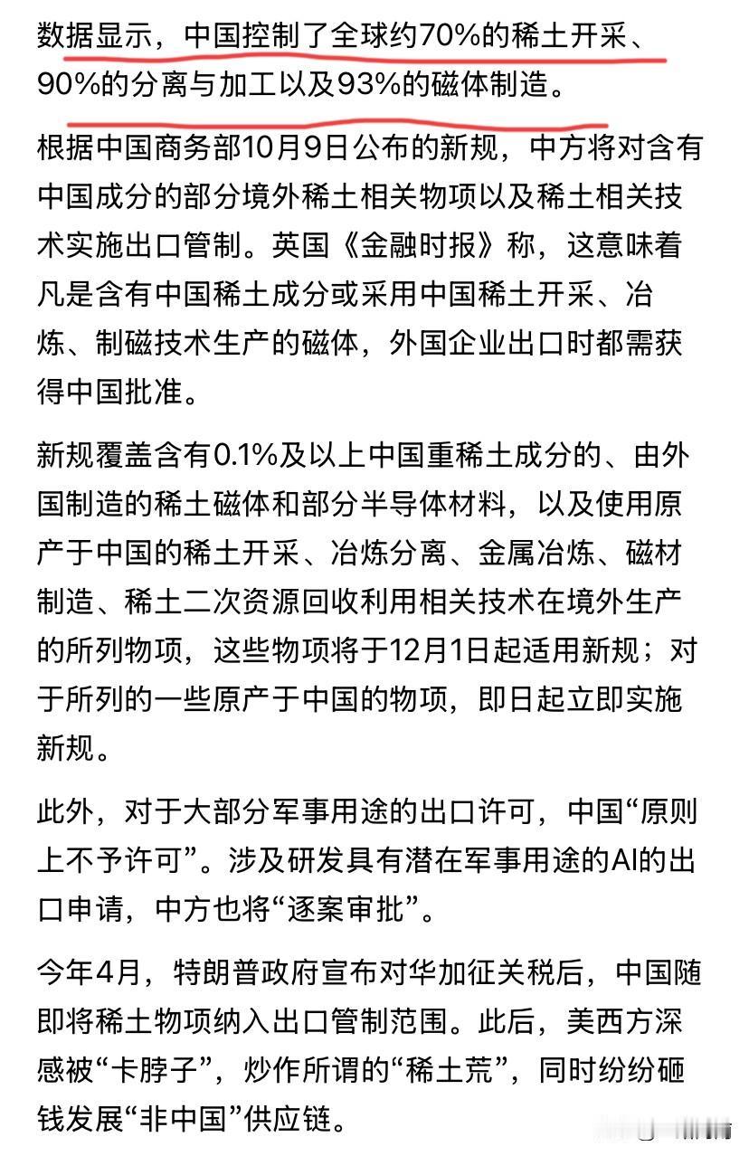 话说出来混江湖的早晚都得还的 几年前以老美为首的西方国家对我们实施半导体以及光刻机的严格管控,各种措施围追堵截,进行长臂管辖 这才过了几年?5.6年的时间,我们已经开始在这些领域有所突破,并且现如今在进行稀土资源的管控,不仅是军事用途不准,就连使用我们的稀土技术也必须得到天安门那里的点头 现在轮到西方国家头疼了,而且这个可能只是刚刚开始发力,后续影响可能远超我们的想象。 不仅稀土以及开采提炼技术管控,锂电池方面的关键技术也在管控…… 你有设备不卖我们,我们让你没米下锅 再看看老美的豆农估计杀了老特的心都有 风水轮流转,几年前的被动,如今慢慢变为主动了。