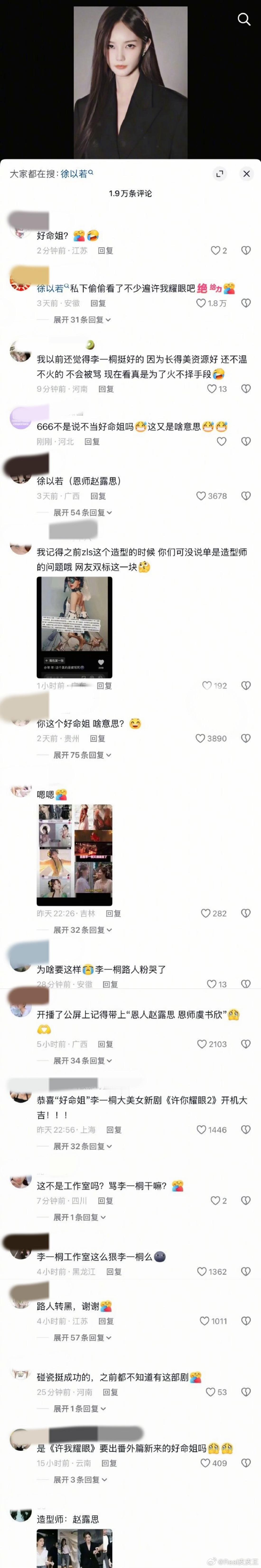 此前,李一桐《美人余》路透造型被指与赵露思《许我耀眼》造型相似度极高,随着舆论的持续发酵,李一桐评论区被质疑声占满了。