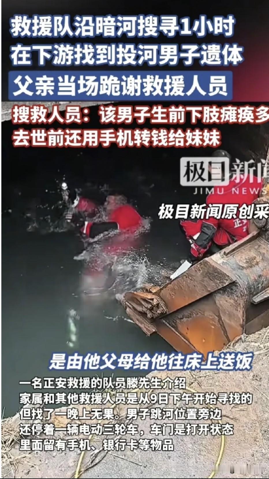 济南瘫痪男子投河前把钱转给妹妹!父亲下跪那刻,我看哭了 济南有个下肢瘫痪、生活不能自理的大哥,选择投河走了,临走前把手机里的钱全转给妹妹,银行卡和手机整整齐齐放在河边。 等救援人员找到人,老父亲当场就跪下,那一下看得人鼻子发酸。邻居说这大哥瘫痪好多年了,以前还能拄着拐出来,后来越来越严重,吃饭都得爸妈端到床上喂,完全没法自己照顾自己。 我猜他走之前肯定熬了好多夜吧?看着爸妈一把年纪,还得天天围着自己转,洗尿布、喂饭、擦身子,他心里应该是很难受的。怕自己是累赘,怕拖累爸妈后半辈子,所以才选了这么个“不麻烦”的方式。 有些残障朋友或重病患者,不是怕疼怕苦,是怕自己成了家人的拖累。其实真的想跟他们说,你在,家就完整;你好好活着,就是爸妈最大的念想。如果能多些方便残障人士的设施,多些居家护理的帮助,或许这样的遗憾能少一点。大哥,一路走好,愿来生你能健健康康,好好享享生活的甜。