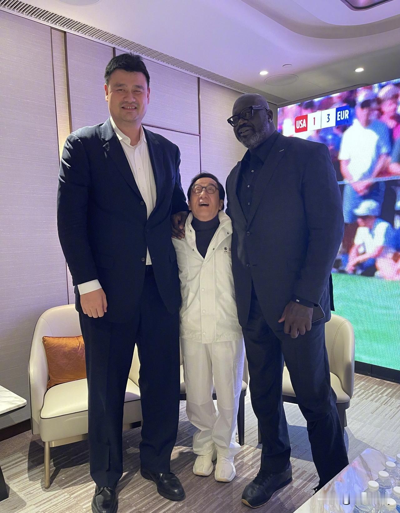 成龙依偎在姚明和奥尼尔胸前,场面过于搞笑!没想到成龙大哥也有如此可爱的一面,即