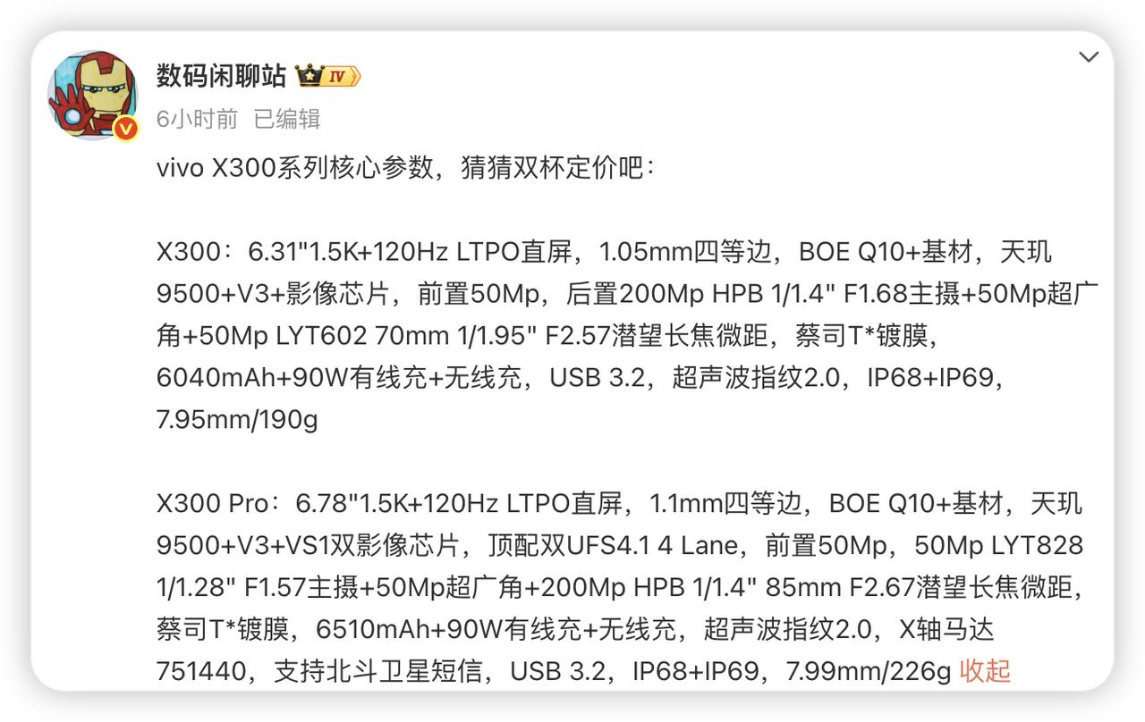 vivo X300把人看麻了!不由得让人为它捏了把汗。 明天vivo X300系列就要发布了,但新机的配置已经提前全面曝光,性能、屏幕、影像和周边这些都没有什么好挑剔的,但电池容量的选择有点迷。 vivo X300采用的是6040mAh电池,vivo X300 Pro采用的是6510mAh电池,如果相比vivo X300和vivo X300 Pro的话,那就是6040mAh VS 7025mAh,6510mAh VS 7500mAh,差距都快1000mAh了,这个的确会让一些网友感到不爽。 但别忘了Find X9是6.59英寸的机身,真正要比的话,vivo X300应该和小米17 Pro相比,这样6040mAh相比对方的6300mAh,也就低了5%左右,这点差距完全可以忽视,但vivo X300 Pro这次就没有办法了,毕竟小米17 Pro Max也是7500mAh电池,虽说实际续航并没有什么问题,但差了1000mAh左右,对于营销来说肯定还是有影响的。