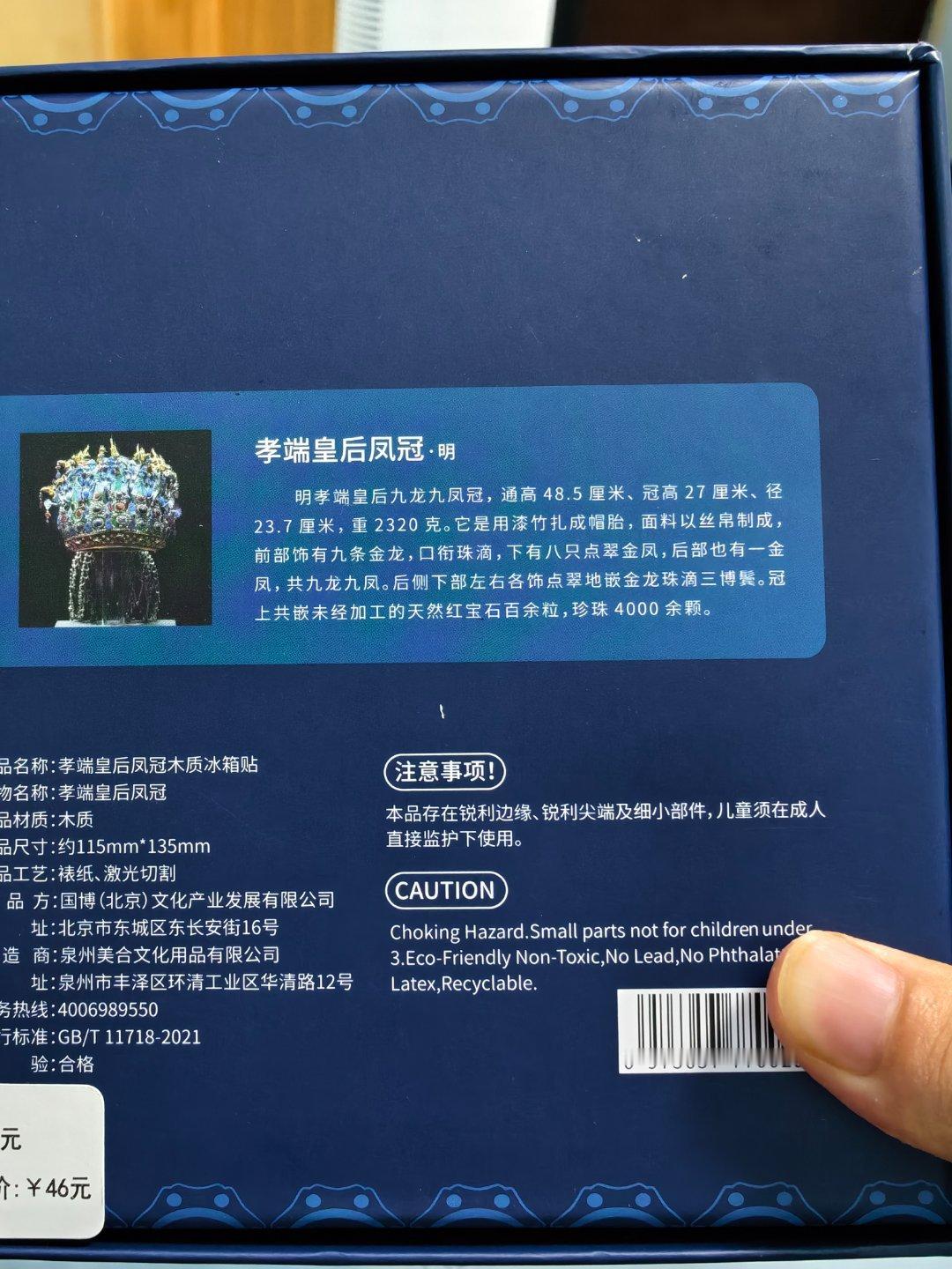 本博总共买过两个,在国家博物馆买的凤冠冰箱贴,一套两个,一个金属,一个木质,好看是挺好看的,但是买太多就没啥意思了。