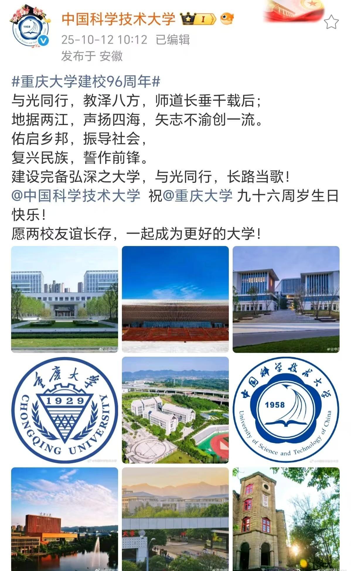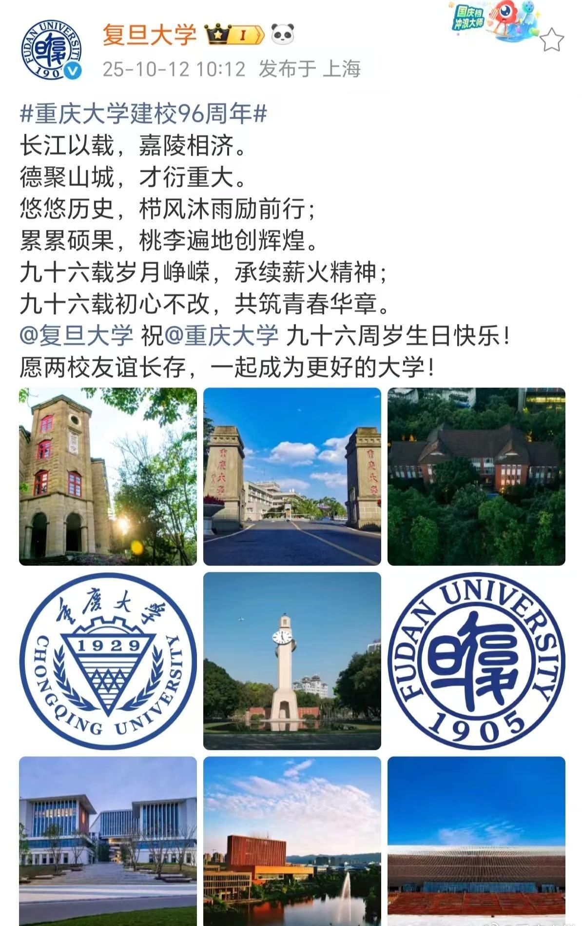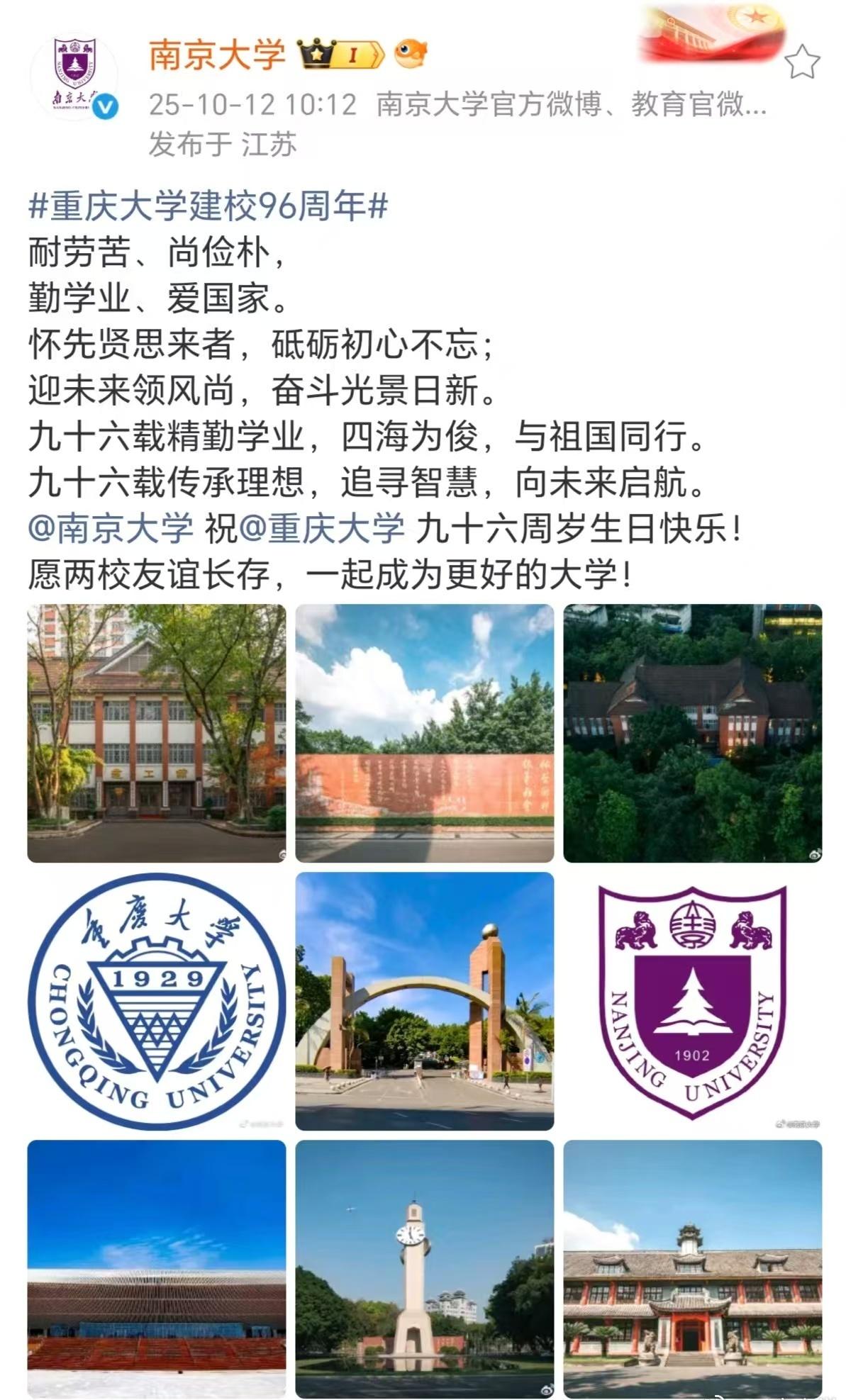 重庆大学超话重庆大学建校96周年今天,在重庆大学喜迎96华诞之际,22所兄弟高校纷纷送上暖心祝福。衷心感谢@复旦大学@中国科学技术大学@南京大学@天津大学@南开大学@西安交通大学@东南大学@同济大学@上海交通大学@中国海洋大学@山东大学@四川大学@电子科技大学@中南大学@中央民族大学@中山大学@中国农业大学@东北大学@重庆邮电大学@重庆交通大学@重庆科技大学 愿我们友谊长存,携手共进,一起做更好的大学!❤️