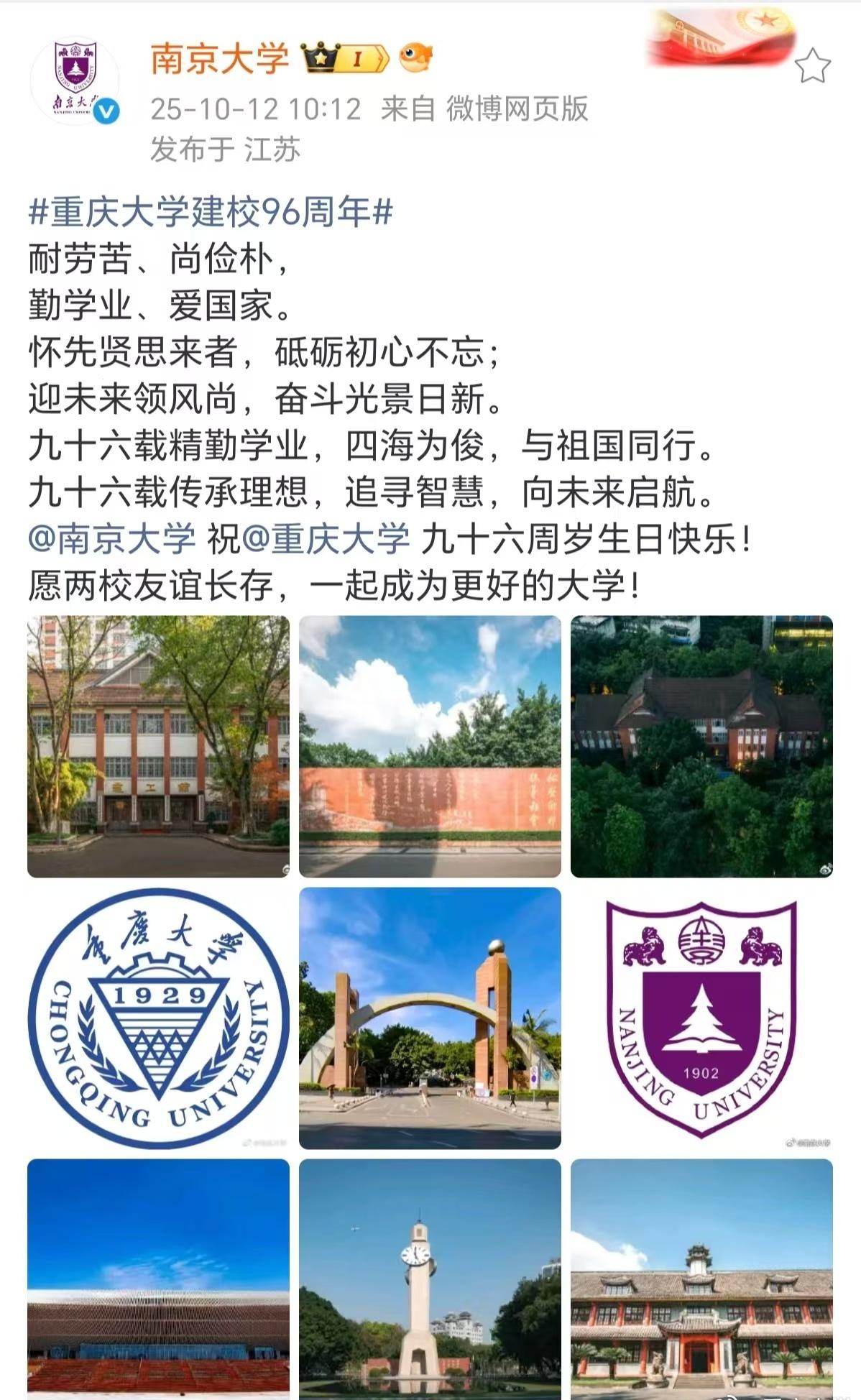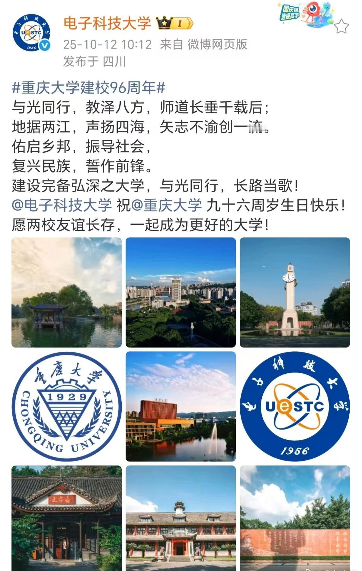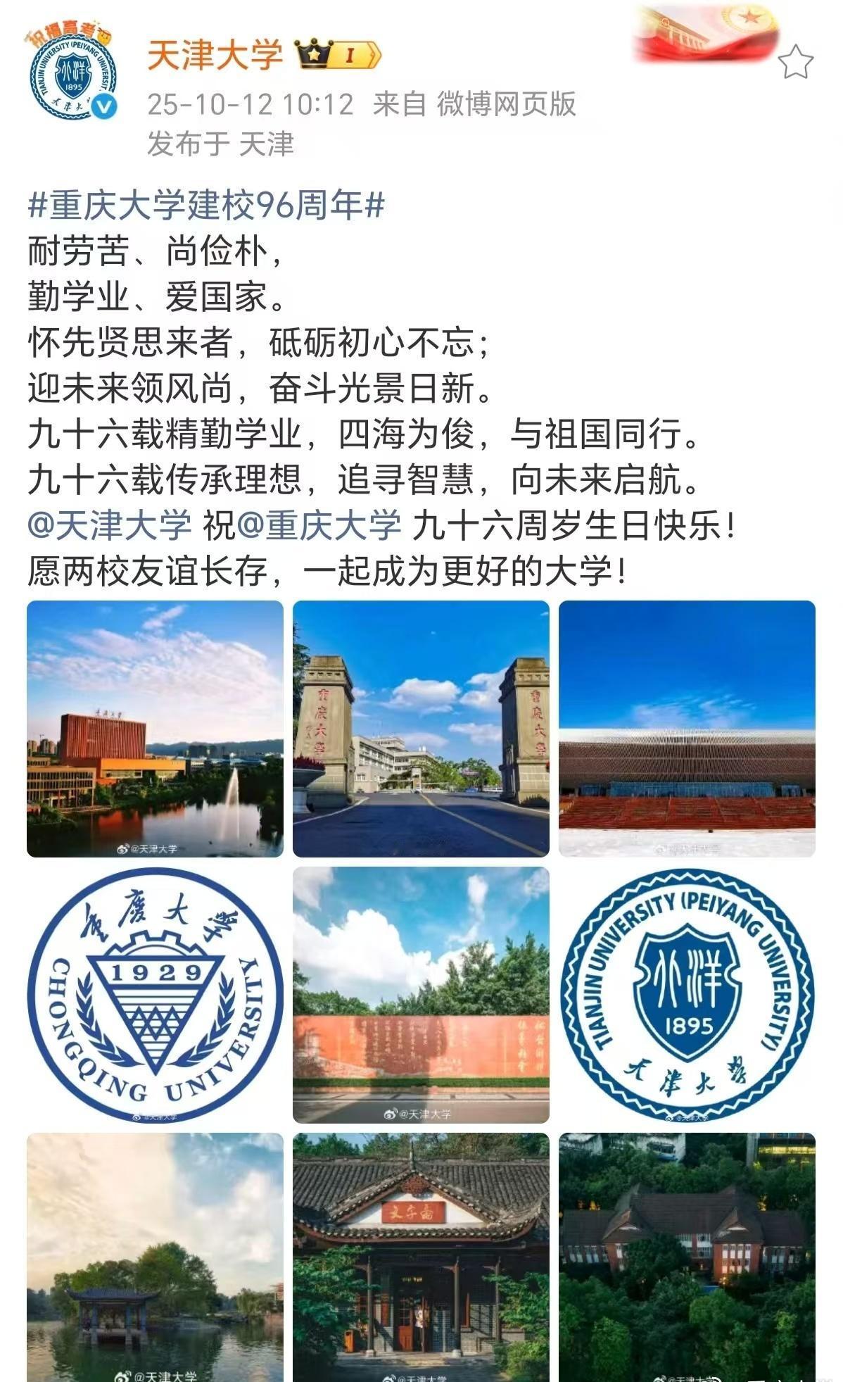 重庆大学超话重庆大学建校96周年今天,在重庆大学喜迎96华诞之际,22所兄弟高校纷纷送上暖心祝福。衷心感谢@复旦大学@中国科学技术大学@南京大学@天津大学@南开大学@西安交通大学@东南大学@同济大学@上海交通大学@中国海洋大学@山东大学@四川大学@电子科技大学@中南大学@中央民族大学@中山大学@中国农业大学@东北大学@重庆邮电大学@重庆交通大学@重庆科技大学 愿我们友谊长存,携手共进,一起做更好的大学!❤️