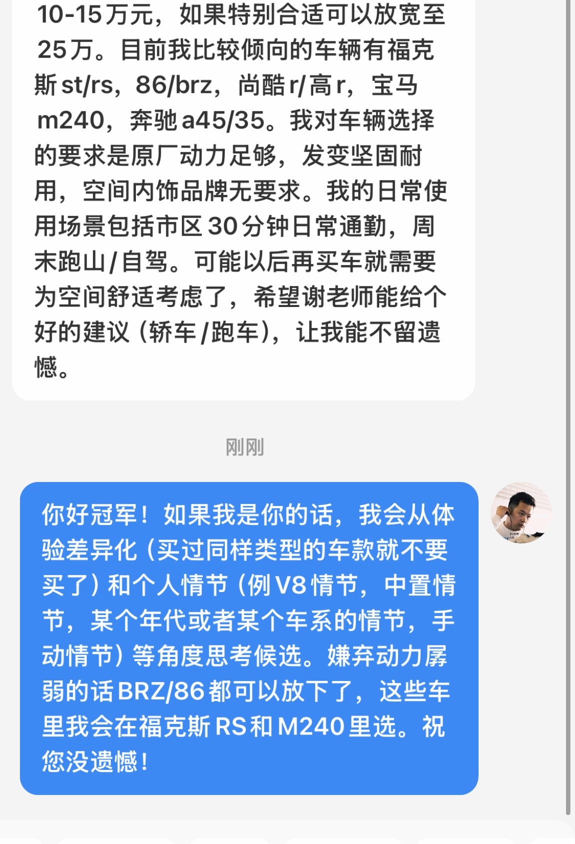 你好冠军!如果我是你的话,我会从体验差异化(买过同样类型的车款就不要买了)和个人情节(例:V8情节,中置情节,某个年代或者某个车系的情节,手动情节,敞篷情节等)等角度思考候选。嫌弃动力孱弱的话BRZ/86都可以放下了,这些车里我会在福克斯RS和M240里选。祝您没遗憾!欣哲频道冠军问答宝马m240i福克斯rs