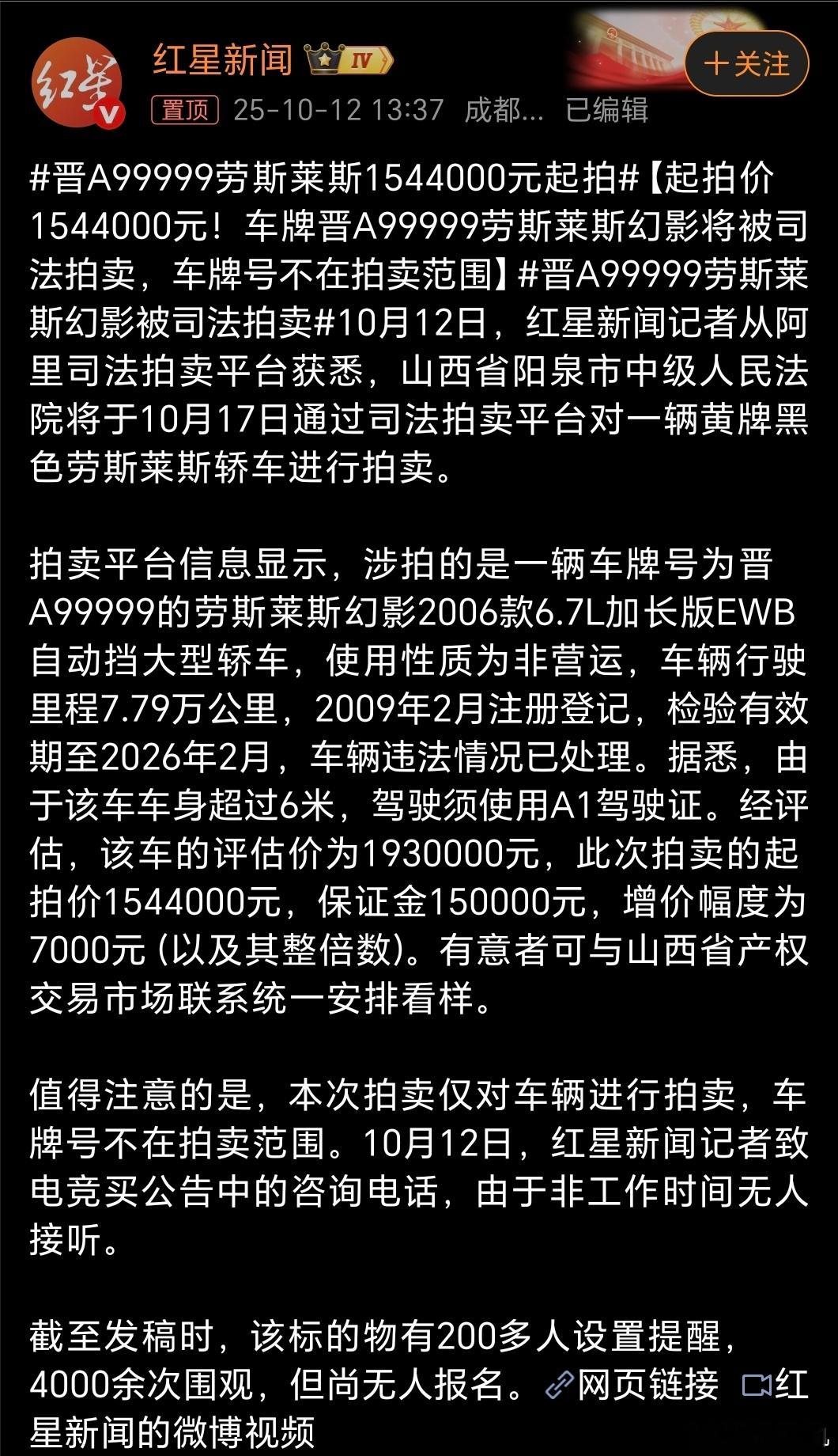 晋A99999劳斯莱斯1544000元起拍