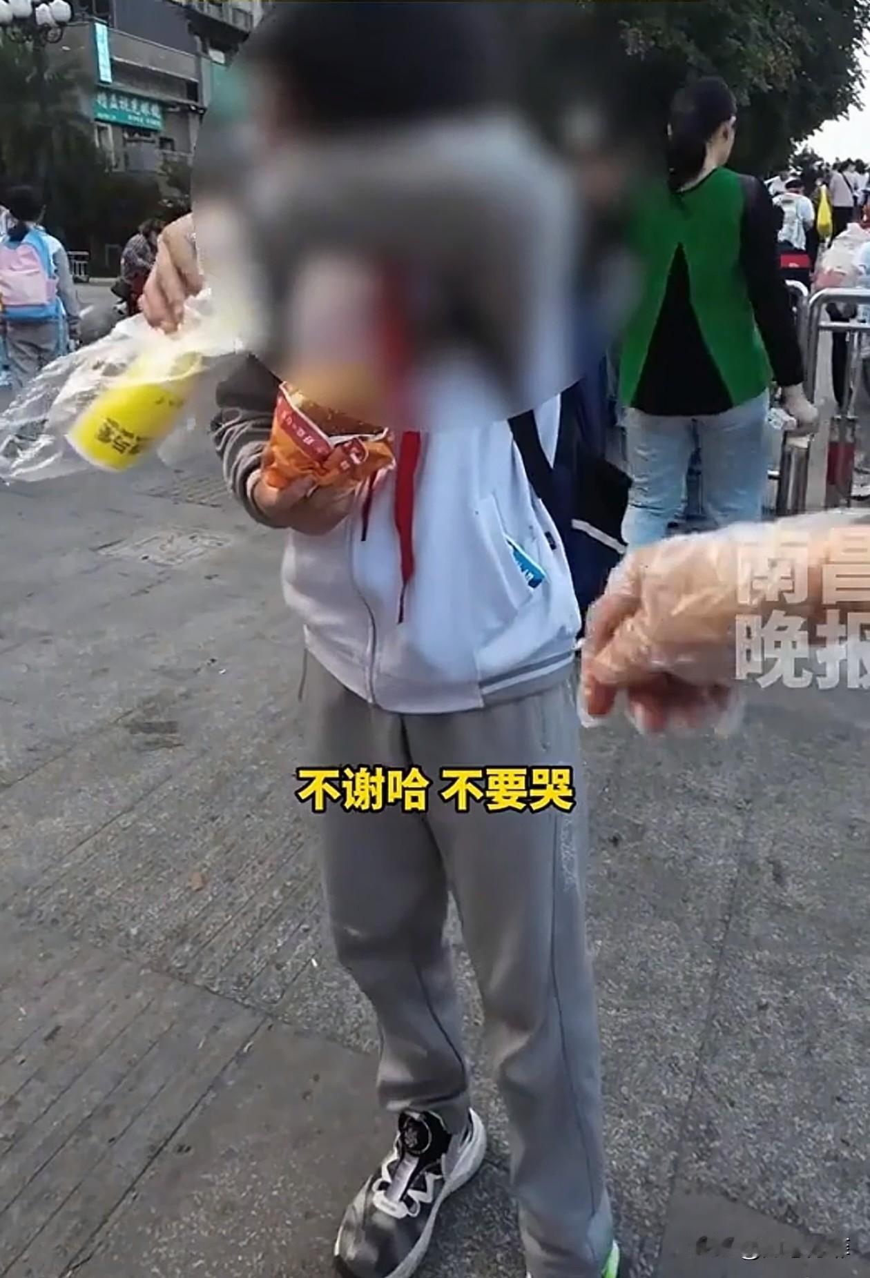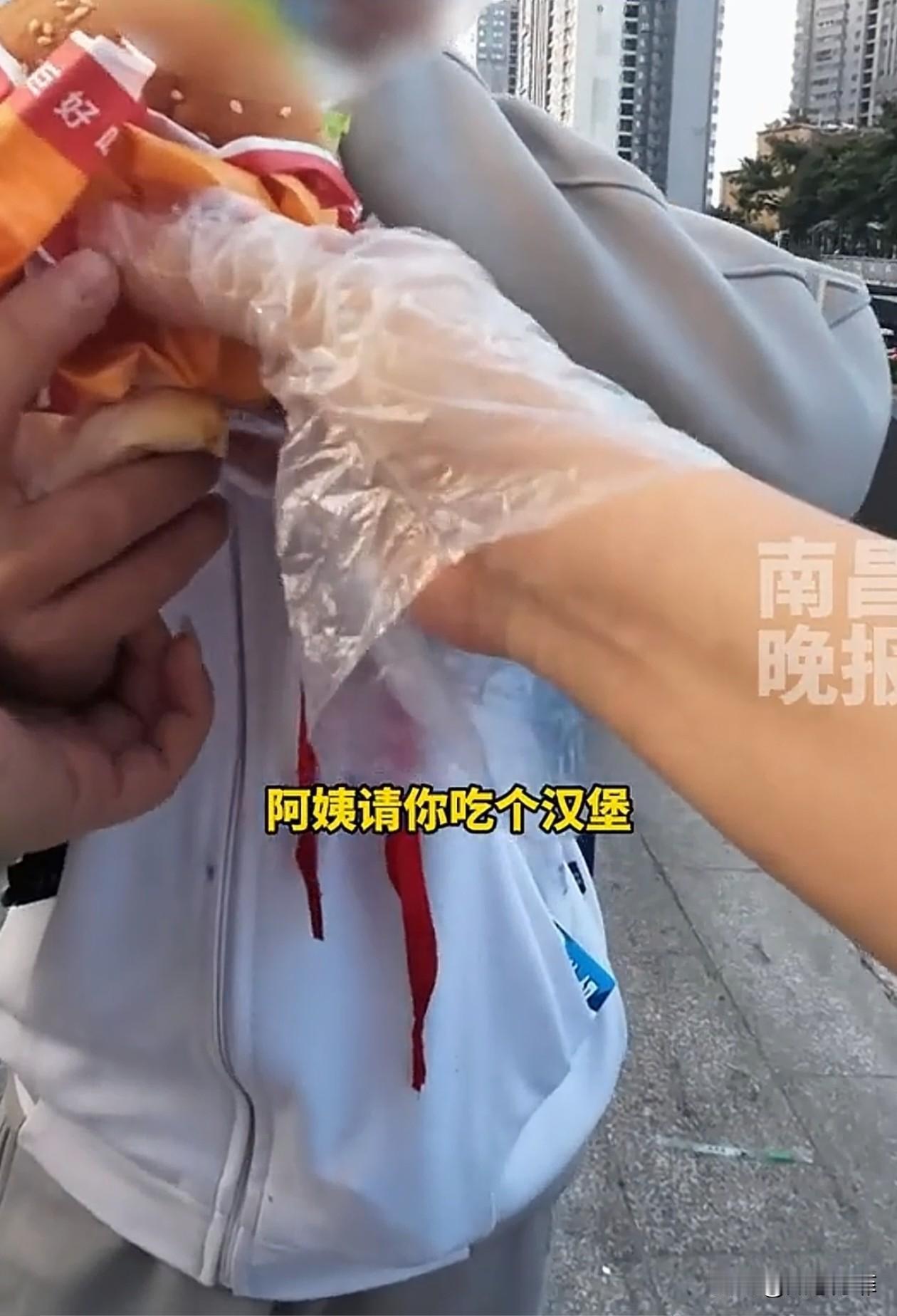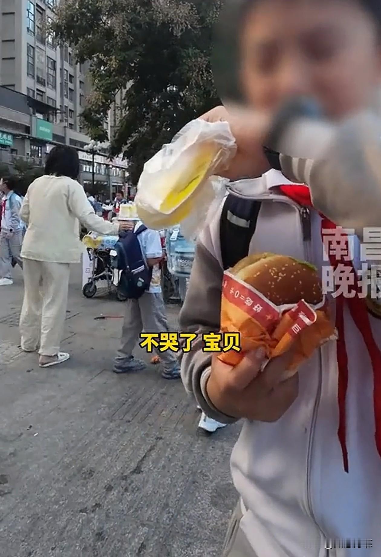 小男孩的早餐被路人碰掉在地上,路人不仅没赔钱还辱骂小孩,旁边好心阿姨看到后暖心安慰,还请孩子吃汉堡。阿姨:不哭了,宝贝,快去上学。 贵州,一个小男孩背着书包走在上学路上,手里拿着刚买的早餐,突然一个路人撞了他一下,手里的早餐全掉在了地上。 小男孩上前跟这个路人交谈,希望对方能赔自己一份,但这个路人不仅没道歉,还把小男孩骂了一顿。 小男孩本来就委屈,还被骂,直接忍不住哭了出来,之后这人不管不顾地走了,留下男孩一个人站在路边掉眼泪。 旁边一个卖汉堡的阿姨看到了,心里特别不好受,她走过去安慰男孩说,不用管他,没关系,阿姨请你吃个汉堡,不哭了,宝贝,快去上学。 阿姨表示自己也是一个母亲,只想让小孩不要饿肚子,也想让小朋友知道这个世界上好人多。 碰掉别人早餐,就算不是故意的,也应该说句对不起,该赔就赔。 骂人就更不应该了,完全就是不讲道理,也不尊重他人,错上加错。