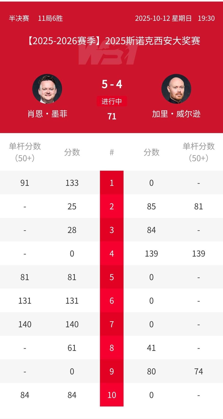 2025斯诺克西安大奖赛第二场半决赛,魔术师下半场状态复苏,6-4险胜加里威尔逊晋级决赛。 决赛对阵:马威—墨菲(19局10胜) 冠军奖金17.7万英镑。