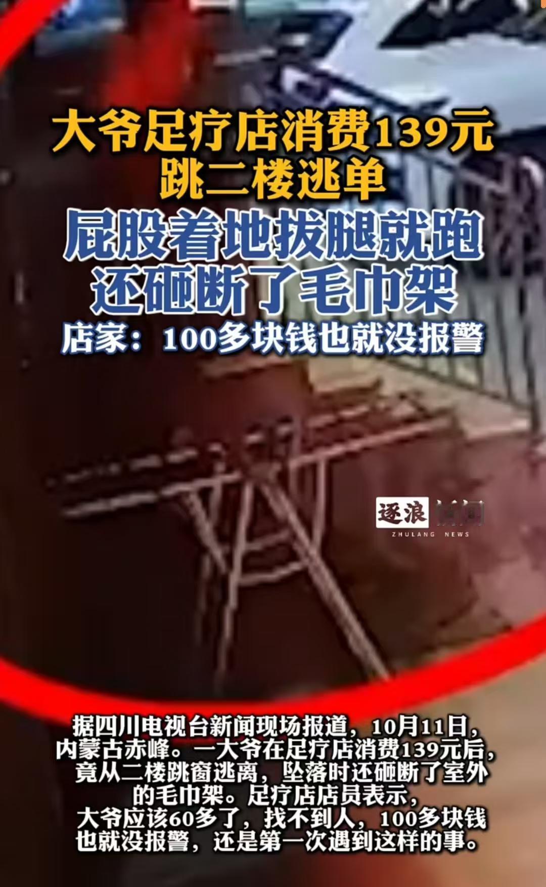 内蒙古,60多岁的大爷,在足疗店消费了139元后,竟从2楼跳窗“逃单”,还砸断了