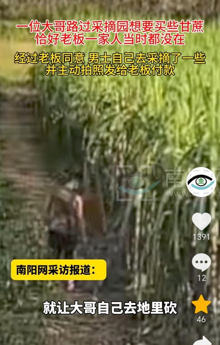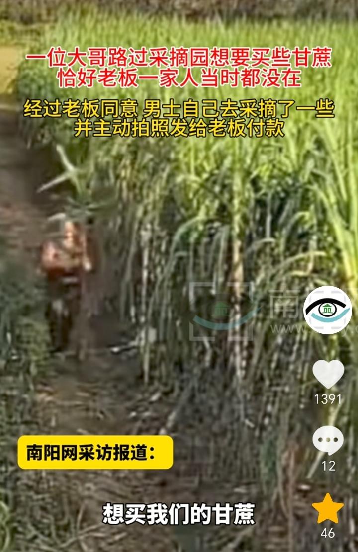 讲诚信!湖北黄冈,一男子路过一片甘蔗地,想买点甘蔗吃,于是就拨打了甘蔗地留的电话,结果主人不在家让男子自己砍。 据南阳网报道,10月9日湖北黄冈,一男子路过一片甘蔗地,想买点甘蔗吃,于是就拨打了甘蔗地留的电话,结果主人不在家让男子自己去砍,男子砍完后加了甘蔗地主人的微信,然后把砍的甘蔗拍照发给了甘蔗地主人并且付款,甘蔗地主人觉得男子的行为很有诚信。 砍完后还拍照让甘蔗地主人看并且付款,可见男子不是那种爱占小便宜的人,并且还非常的有诚信,不会因为甘蔗地主人不在而动歪心思,甘蔗地主人也是比较信任男子,让男子自己砍,由此可见男子和甘蔗地主人都是善良的人,他们双方都互相信任,为社会正能量点赞。 原本人与人之间就应该相互信任,就是因为有些别有用心之人的过度消耗,才导致了人与人之间没有了信任可言,有的只是防备和戒心。