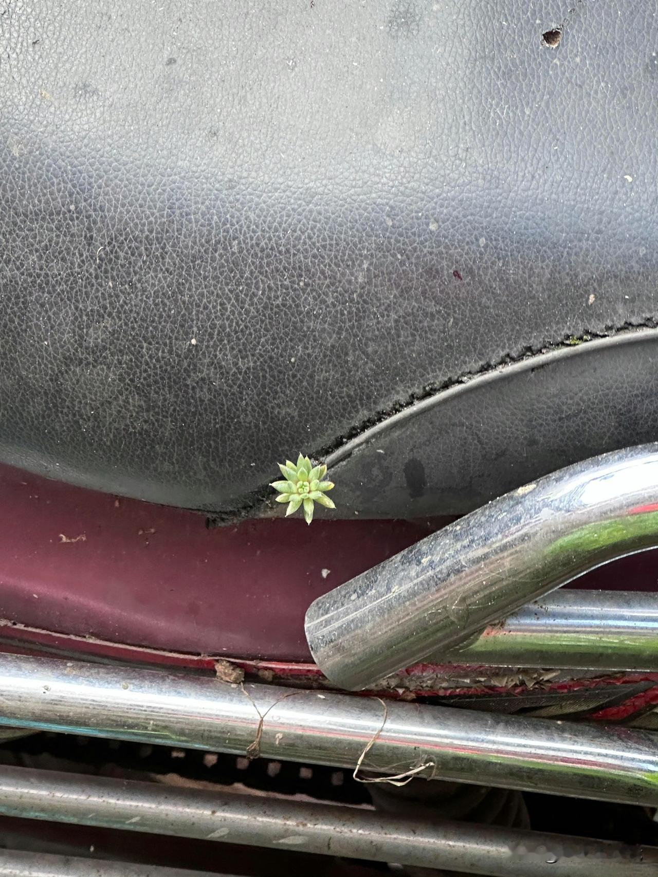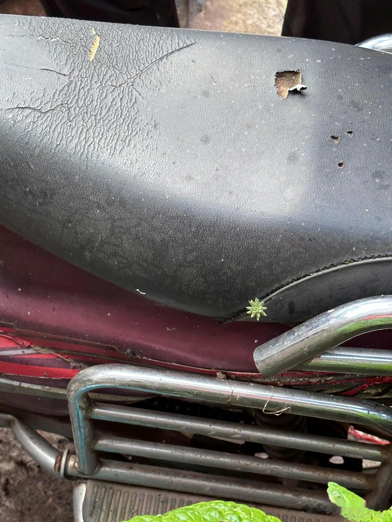 今年的甘肃雨水有多充足? 一张照片就能让你感受到! 多肉都长到摩托车上来了…… 看看放了两周的摩托车, 因为近日连续阴雨, 所以把摩托车放着一直没有动, 谁知这一放就是两周, 今天天气好转, 当我去骑的时候, 发现摩托车上边长了个多肉。