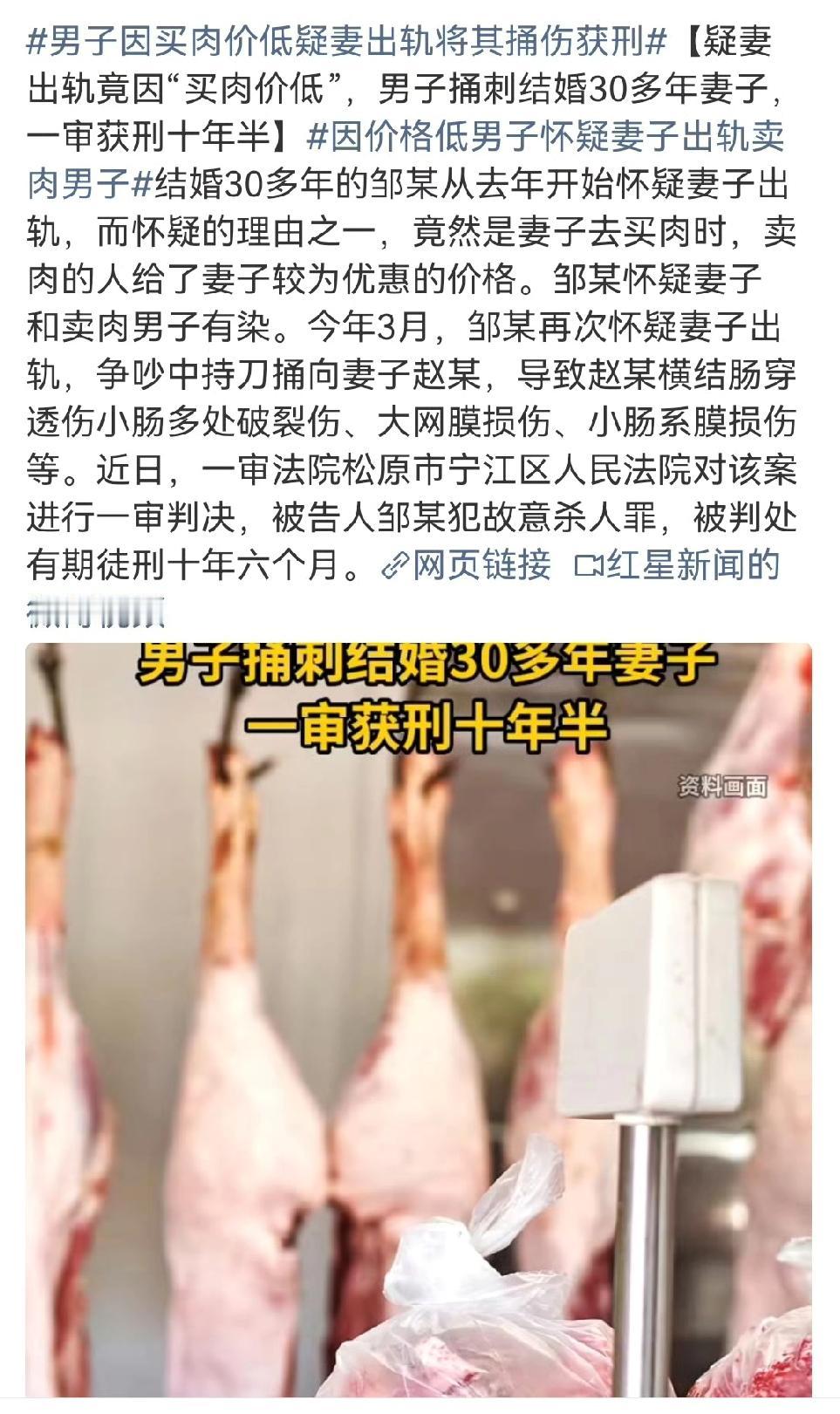 就因为买肉价低,结婚30多年的丈夫把妻子捅了,判刑十年半! 你敢相信吗?就因为老婆买肉时的价格比别人低,丈夫邹某居然怀疑她和卖肉的有一腿。 邹某和妻子结婚30多年了,从去年开始就疑神疑鬼,总觉得老婆出轨了。其中一个离谱理由,就是老婆买猪肉时,卖肉的给了优惠价。他就认定老婆和卖肉的有染。 今年3月,邹某又因为怀疑老婆出轨,和她大吵一架。吵着吵着,他居然拿起刀捅向妻子赵某。这一刀可不轻,把赵某的横结肠、小肠都捅伤了,大网膜和小肠系膜也没逃过损伤。 最近,松原市宁江区人民法院一审判决,邹某犯故意杀人罪,被判有期徒刑十年六个月。 你说说,就因为这点儿破事,把自己送进监狱,把老婆害成这样,值得吗?夫妻之间连这点信任都没有,还过什么日子?婚内杀妻 丈夫对妻子施暴 妻杀夫案 丈夫杀妻死缓案 对丈夫的惩罚 丈夫持刀杀妻 丈夫对妻子背判 丈夫获刑 信息来源:红星新闻