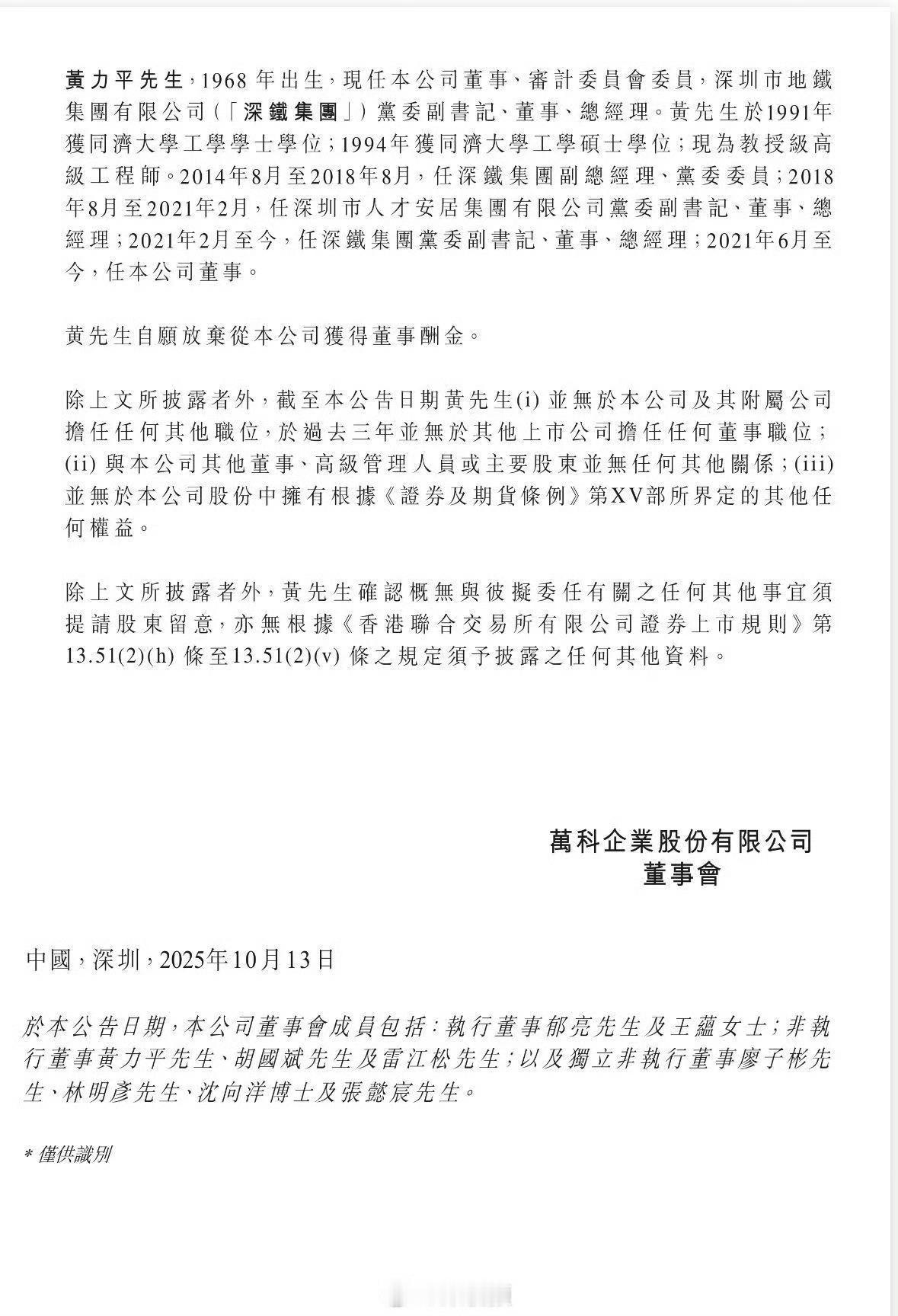 黄力平现任深圳地铁党委副书记、董事、总经理,2021年开始出任万科董事。
