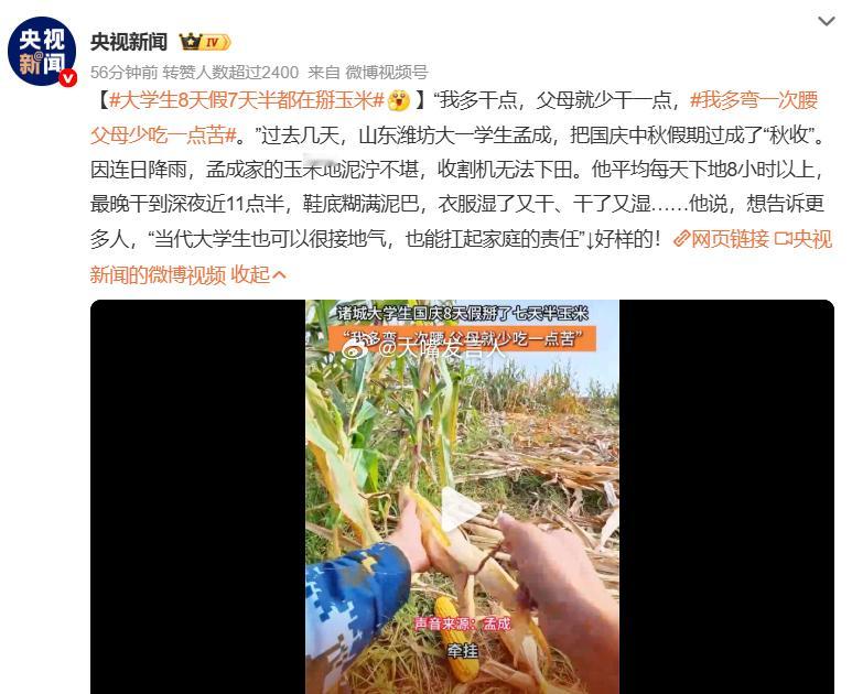 放假8天7天半掰玉米大学生回应质疑 我上中学时的农村同学们,在秋假期间主要的任务就是帮助父母收秋,大学生8天假7天半都在掰玉米,这算什么呀,我有些男同学在夏季高温的庄稼地里用喷壶打农药,还能打药打到自己中毒倒地的地步呢[汗][汗]