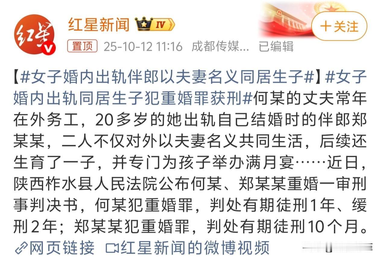 丈夫长年在外务工,女子出轨自己结婚时的伴郎,两人对外以夫妻名义共同生活,后面还生了一个孩子,并专门为孩子举办满月宴。法院:犯重婚罪。 陕西,2019年,女子和丈夫登记结婚,办婚礼时,男子是伴郎,女子与他相识。婚后丈夫为了养家,经常外出打工,家里大部分时间只有女子一个人 。 男子那时候还没结婚,但他明知女子已经有丈夫,还是和她越走越近,没多久就发展成了不正当关系。 从2020年开始,男子和女子直接搬到一起住,而且对外都自称是夫妻,周围人也都以为他俩是正经夫妻 。 2022年12月,女子生下了一个男孩,孩子是男子的。在医院分娩时,男子直接以配偶的身份签了各种手续。 2023年2月,两人还在当地饭店给孩子办了满月宴,女子的亲戚和男子的父亲都去了,这段关系彻底公开。 之后女子带孩子的生活费,也全是男子承担的。 满月宴办完一个多月后,两人公开同居的事被传开了,最终捅到了法院,两人主动承认事实,被追究责任。 最后,女子被判有期徒刑1年,缓刑2年,男子被判有期徒刑10个月。