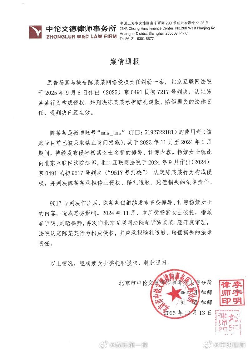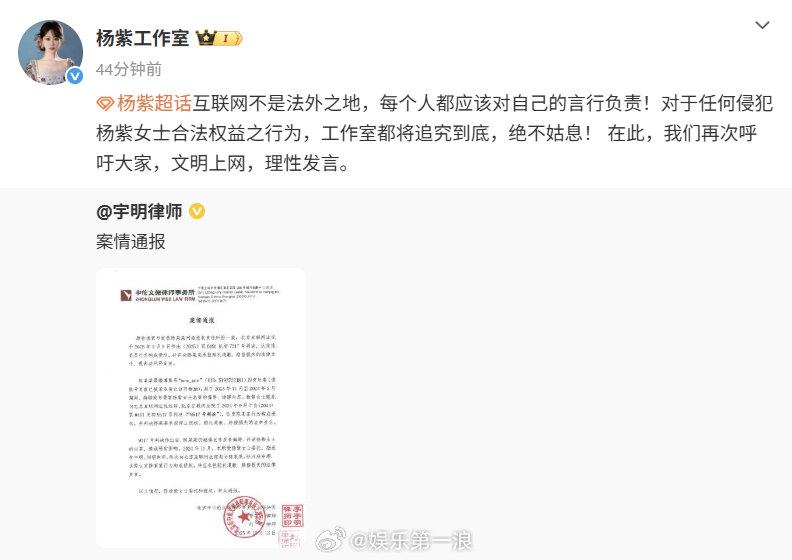 杨紫工作室声明追究侵权杨紫工作室绝不姑息侵权演员发布声明,称将对侵犯杨紫合法权益