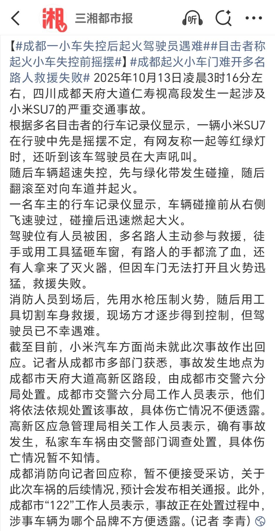 成都 小米看了几个比较全的视频和图片,心有余悸,虽然那几个路人救援失败,但确实已经尽力了,逝者安息。