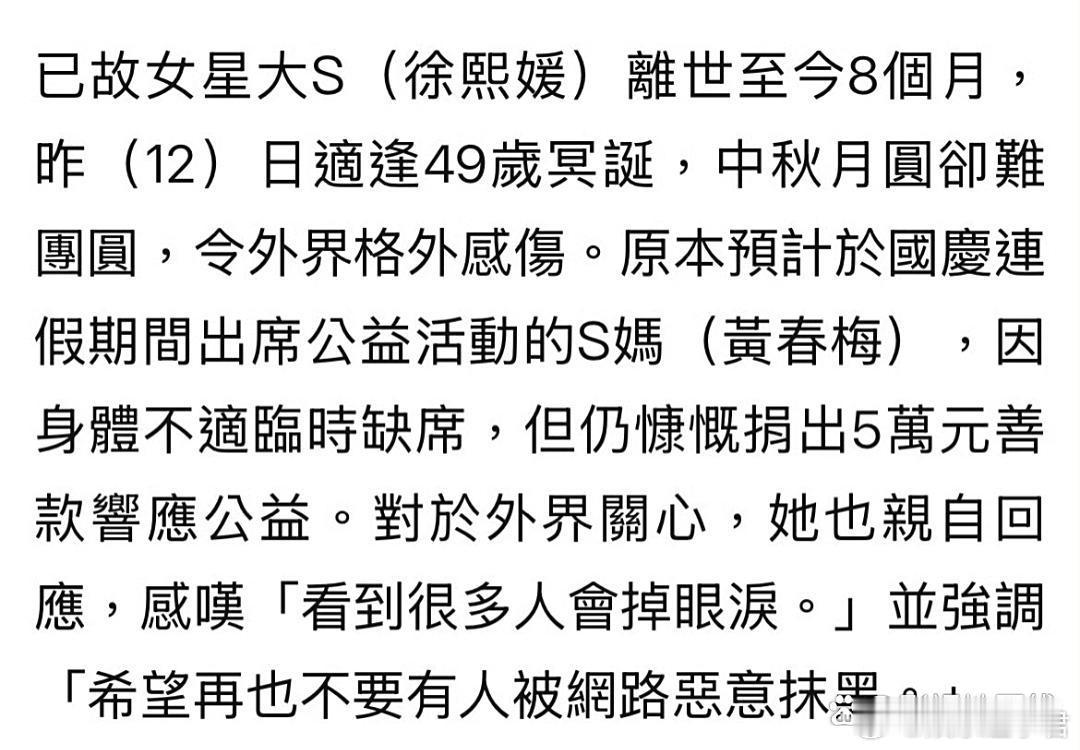 S妈身体突然不适据台媒,12日,S妈原定出席公益宣传活动,却临时因身体不舒服而缺席,不过,仍捐5万元表达爱心。