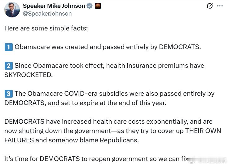 民左党大幅提高了医疗成本,现在却关闭政府——他们试图掩盖自己的失败,却又把责任推给共和党。