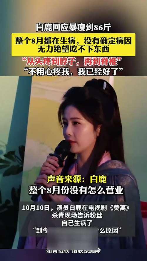2025年10月10日,白鹿在《莫离》杀青现场透露,自7月18日起她持续头痛,疼痛蔓延至颈椎与脖子,辗转多家医院、十余个科室,完成脑部CT、核磁共振等检查,均未明确病因。8月她暂停公开活动专心治疗,体重骤降至86斤,最终通过针灸与药物缓解症状,坦言“那段时间特别绝望”。