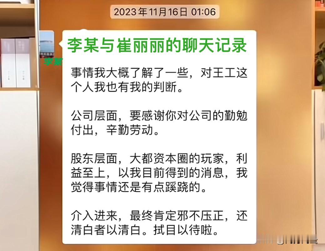 崔丽丽被开除前与投资人的对话交锋 在2025年9月22号之前,没几个人知道这个崔某和老王的故事,之所以称之为故事,是因为他们之间虽有事,但事发两年前。 崔丽丽全网开账号,全链接覆盖,在崔某某的努力下,网络上沉渣泛起,旧事被重提,在民间掀起的舆论风波吓死人。 老王已入狱,探秘线索指向了崔丽丽的个人账号。这或许是最接近真相的地方。 最近,有人转发了崔某某大骂投资人李某的视频。 从崔某某的爆料内容来分析,李某应该是老王的投资人,他劝崔丽丽以公司利益为重,称“我有我的判断”。并且明确表示出了对崔丽丽的不信任,他称“事情有点蹊跷的”。 从两个人的对话中明显看得出来,李某力挺老王,“邪不压正,还清白者以清白”,这句话的分量很重。 李某的此番表态,无疑是在质疑崔丽丽的案情。 当时的崔丽丽停薪后在家休养,她愤怒的录视频表达了对李某的不满和指责。 崔丽丽怒怼李某: “你是有特赦令还是有通天术” “你个蠢驴”