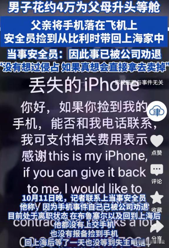上海,一男子很孝顺,为让父母舒适旅行,花40000元给父母升头等舱,父母登机前往布鲁塞尔,下飞机时父亲遗落在了手机上,男子的母亲当时两次拨打遗失的手机,一次无人接听,第二次直接关机了,男子给手机留言送回手机必定重谢,也没有等到捡拾者的联系,后来定位手机在机组人员定点休息的酒店,报了警以后也没有结果,5天后手机才归还回来,男子要求航空公司道歉赔偿遭到拒绝。 据报道了解,男子一直盼着能让年迈的父母好好享受一次旅行,为此花了整整4万块钱给父母升了头等舱。 2025年9月14日,父母登上了前往布鲁塞尔的飞机,几个小时后,飞机顺利抵达目的地。 可就在父母下飞机后,父亲发现自己的手机不见了,仔细一想,原来是遗落在了机舱里。 老人心里一阵着急,本想返回机舱去拿,可国 际 规定不允许出舱乘机人员返回。 无奈之下,老人只好赶紧联系工作人员帮忙寻找,男子的母亲也赶忙掏出手机,拨打丢失的手机号码。 第一次拨打,无人接听,又接着拨第二次,这次手机直接关机了,随后把情况也告诉了儿子。 男子得知后,立刻拿出自己的手机,利用防盗功能锁住了父亲的手机,还在屏幕上用中英文留言,表示愿意支付感谢费,只求能找回手机。 几小时后,他查看手机定位,发现手机竟然出现在了布鲁塞尔一家机组人员定点休息的酒店。 他赶忙联系航空公司,希望能得到帮助,可航空公司只是敷衍地回应,并没有重视这件事。 9月16日,男子再次查看手机定位,发现手机又跑到了上海青浦的一个小区。他立刻报了警,可民警找了半天,也没有找到手机的踪迹。 这几天里,男子一直为找到手机的事忙的焦头烂额,父母也因为手机丢失而心情低落,原本好好的旅行,变得有些糟糕。 男子觉得航空公司在这件事上负有不可推卸的责任,他多次联系航空公司,要求他们道歉并赔偿损失。 直到9月18日凌晨,一个陌生人突然联系男子,说捡到了手机,愿意归还。 原来,捡到手机的是航空公司的一名安全员。 他捡到手机后,心里十分害怕,担心会受到公司的处罚,就想私下解决这件事,可没想到事情越闹越大,最后还被公司劝退了。 男子拿到手机后,他再次找到航空公司,要求他们道歉并赔偿。 航空公司却觉得男子的索赔要求过高,不愿意承担这么多费用。双方都有各自的看法,一直互不相让没有谈拢。 有人觉得是航空公司管理不善,应该承担责任,也有人觉得手机已经送回来了,男子不应该索赔。 那么,以法律角度,乘客物品遗失在飞机上,航空公司是否应该负有相应的责任呢? 1,据《民法典》第824条规定,在运输过程中,旅客随身携带物品毁损、灭失,承运人有过错的,应当承担赔偿责任。 乘客手机遗落在机舱,航空公司作为承运人,有义务妥善保管乘客遗失物品,并积极协助寻找。 然而航空公司先是敷衍回应,没有重视乘客物品丢失问题,后续也没有积极配合乘客寻找手机,导致手机长时间未被找回,显然存在过错。 2,航空公司安全员捡到手机后,并没有第一时间归还手机,这种行为该怎么认定 呢? 《民法典》第314条规定,拾得遗失物,应当返还权利人。拾得人应当及时通知权利人领取,或者送交公 安等有关 部 门。 安全员捡到手机后,不仅没有及时归还,还因害怕处罚想私下解决,这种行为违反了法律规定。 而且其私自处理遗失物,导致手机流转多地,给乘客造成困扰,进一步加剧了航空公司的过错程度。 3,男子要求航空公司道歉并赔偿,是否有合理的依据呢? 手机丢失不仅给父母带来经济损失,还影响了旅行心情,造成精神损害。 据《民法典》第996条规定,因当事人一方的违约行为,损害对方人格权并造成严重精神损害,受损害方选择请求其承担违约责任的,不影响受损害方请求精神损害赔偿。 所以,男子要求航空公司赔偿包含精神损害在内的损失,在法律上有一定支撑。 4,航空公司认为索赔要求过高,从法律角度,赔偿高低的依据是什么呢? 据《民法典》第1184条规定,侵害他人财产的,财产损失按照损失发生时的市场价格或者其他合理方式计算。 男子需证明手机价值以及因手机丢失导致的其他直接损失,如因无法使用手机产生的通讯费用增加等,同时精神损害赔偿也需符合当地的标准。 最终若双方无法协商解决,可能通过诉讼途径解决,会根据双方提供的证据,判定航空公司是否承担责任以及承担责任的范围。 若判定航空公司承担责任,航空公司需按照判决进行道歉赔偿,若航空公司不履行判决,男子还可以申请强制执行。 航空公司在乘客物品管理方面存在漏洞,在遇到类似情况时,要懂得维护自身的权益。 您对这件事有什么看法呢?