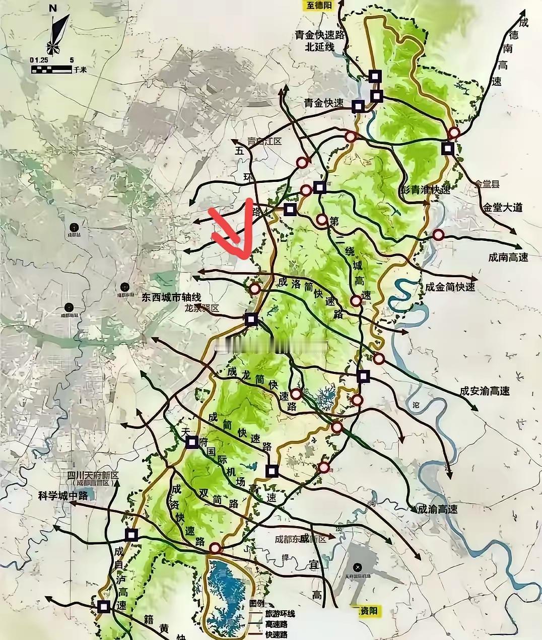 如果成都心里还想和重庆在成渝双城经济圈中一争高下,还想成为一座具有全球影响力的超大城市,那么就必须想通一个关键逻辑:必须跨龙泉山发展。 若成都一直“聚焦”在龙泉山以西的传统城区,是很难在城市能级上实现质的跃升的。看看南京,长江天堑都挡不住它跨江造城的决心;瞅瞅郑州,黄河的宽度也没能阻碍它谋划“北抬”的布局。龙泉山虽为成都平原与川中丘陵的自然分界,但论地理阻隔的突破难度,远小于江河天险。成都也好,四川也好,必须给城市发展规划来一次“东向破壁”。 最优的路径就是深度激活龙泉山东侧的发展势能,以现有东部新区为核心,联动资阳、德阳的部分区域(如资阳临空经济区、德阳广汉的协同板块),让成都顺理成章地将发展版图“东拓”,进而大刀阔斧地推进跨山一体化规划。把龙泉山从城市的“边缘屏障”,转变为城市内部的生态绿心与景观轴线——山间的丹景台可以成为市民日常观景的打卡地,山脚下的三岔湖能化身城中湿地的明珠,让龙泉山景观真正融入成都的城市肌理。 如此一来,一座横跨龙泉山的超大城市,才能展现出它的“完全体”形态:西边是底蕴深厚的天府锦城,东边是活力迸发的东部新城,产业上既有西部(成都)科学城的创新策源,又有东部新区的先进制造与临空经济;空间上打破“西密东疏”的旧格局,实现全域均衡生长。唯有这样,成都才能在成渝双城的竞合中,真正撑起“极核”的分量,在超大城市的赛道上跑出属于自己的加速度。