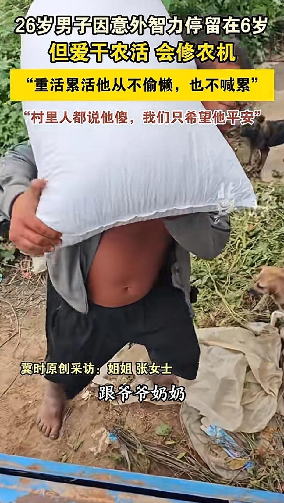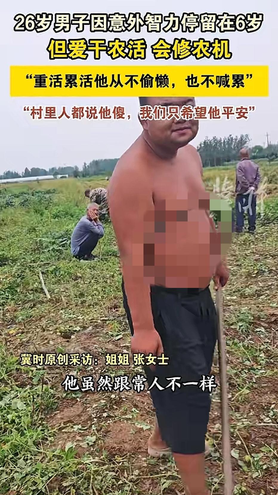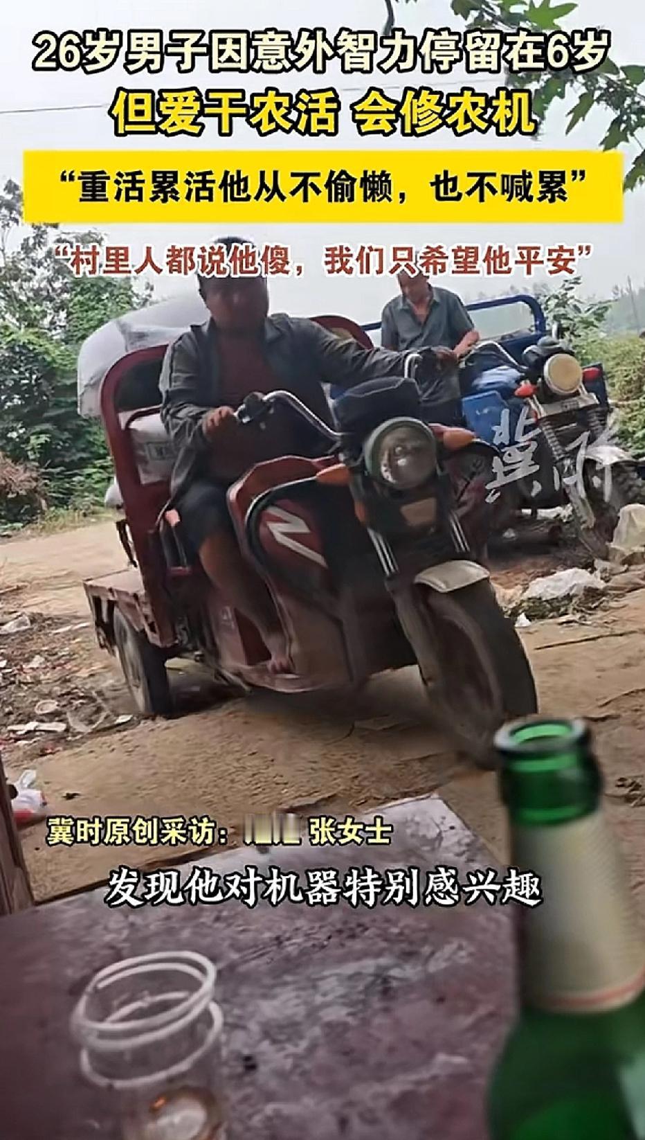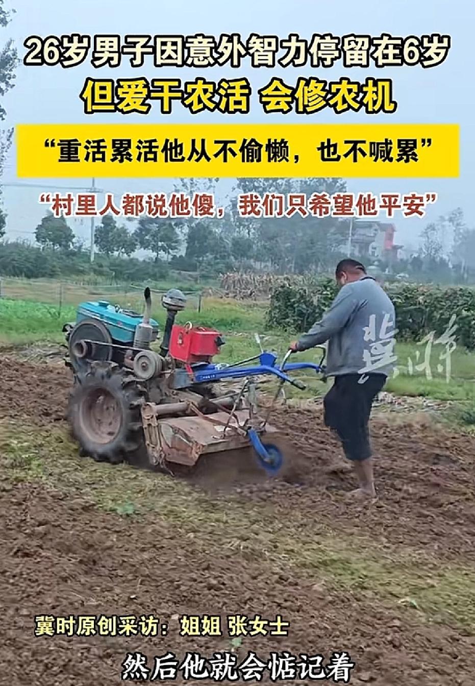 六岁那年,男孩从平房顶上不慎摔下,头部受了重伤,自此智力永远停留在了六岁。 当时,爷爷奶奶带着他到平房上晒稻谷,谁能料到会发生这样的意外。 在他十三岁时,父亲开始教他干农活。 令人意外的是,男孩干起农活十分卖力,从不偷懒,成了父亲的得力帮手。 如今,男孩已经26岁了。在家人的悉心爱护下,他总是挂着灿烂无邪的笑容,还学会了修理坏掉的犁地机和电动三轮车等农用工具。 男孩的姐姐满脸骄傲地说:“别人都说我弟弟傻,可他很勤奋,脏活累活都抢着干。他对机械修理很感兴趣,现在村里谁家的农用机械坏了,找我弟弟去,一会儿就能修好。” 嘲讽智力障碍人士“傻”的人,是没有素质的表现。 智力停留在六岁,他是跟不上世界前行的脚步,家人却能放慢速度,陪他一同欣赏人生风景。 家人常年的爱与悉心呵护,让他的人生依旧熠熠生辉。 原来,爱并非使人走向成熟,而是让人无论年岁几何,都能拥有纯粹的精彩。 来源:翼时