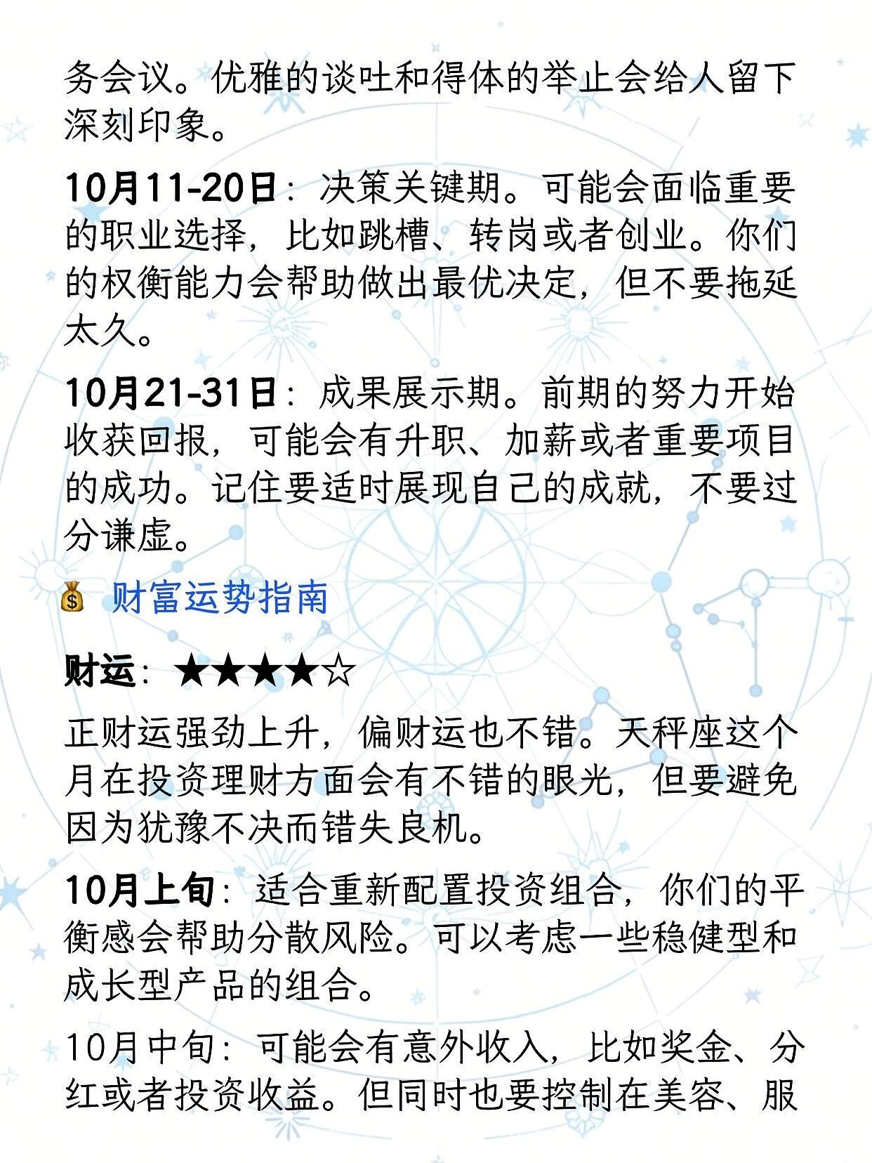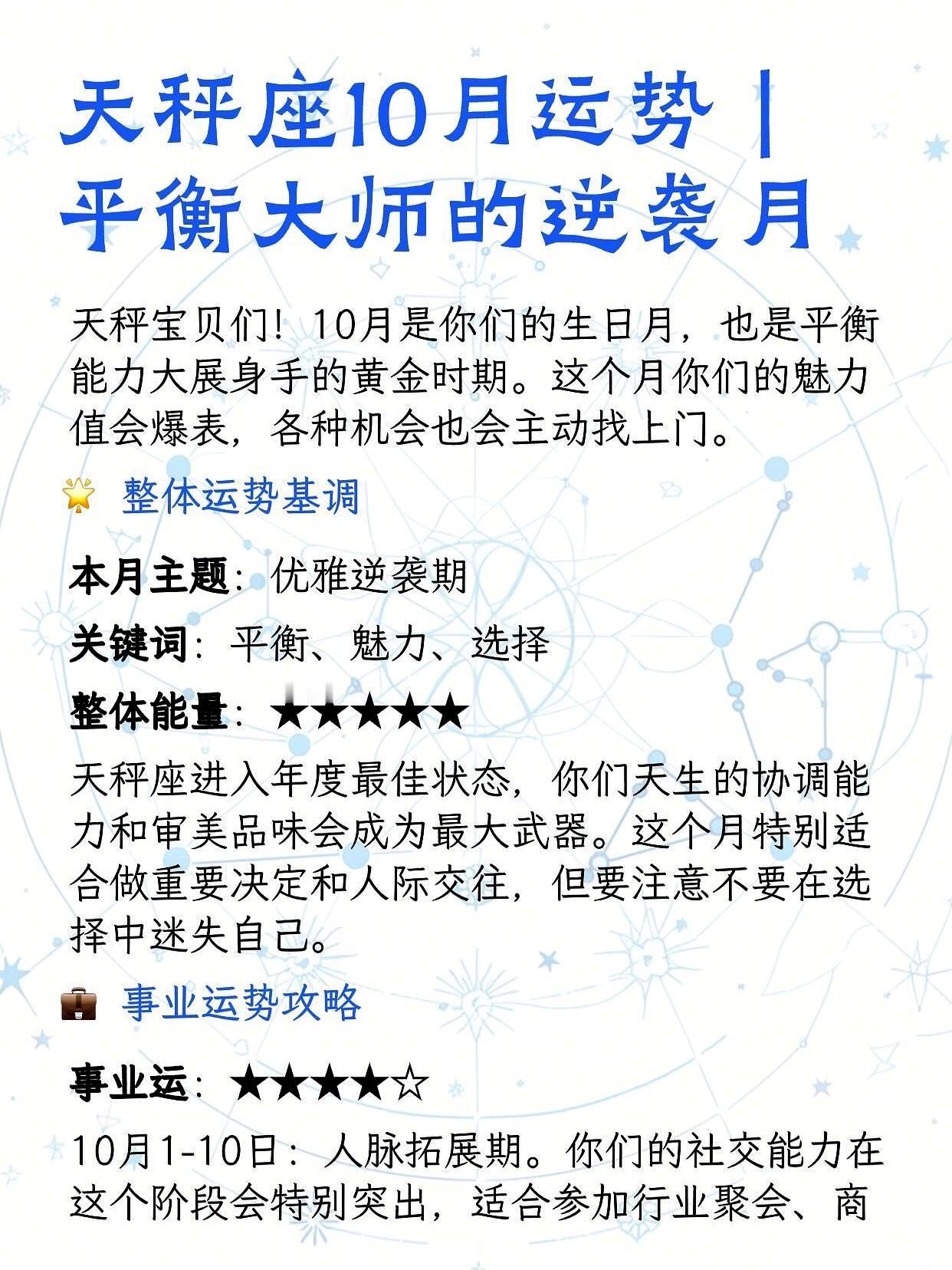 天秤座注意! 10月好运直接开大招——生日月自带喜气,金星从5号起在本宫顺行,整个人像装了信号塔,机会、贵人、桃花全往你这儿飘。 @小秤子上周刚帮市场部调解完预算扯皮,领导当场拍板:"下个月重点项目让你牵头";@秤子酱更绝,用周末时间在小红书做穿搭博主,靠条理清晰的"通勤3套公式",两周接了5单定制方案。 工作上别藏着你的"中间人"本事,同事吵起来你往中间一站,三言两语就能把两边捋顺,这月露一手,升职加薪不远了。想搞副业的盯紧审美相关——某平台数据显示,天秤座做线上搭配师、方案策划的接单量比其他星座高20%,试试就知道多顺。 感情里金星正给你牵线:单身的多去人堆里晃,咖啡馆看书、创意市集摆摊,网友@月牙说她对象就是在市集帮她捡掉落的发夹认识的,"他笑起来眼睛弯弯的,像揣了颗糖";有对象的记得嘴甜,一句"你今天处理问题好果断",比转账还让对方心暖。 但别光对外平衡,对自己也上点心:晚上少刷手机,早上花5分钟做猫式伸展,周末约朋友爬个小山,身体松快了,好运才能踩稳脚。 10月机会不等人,秤子们,该出手时别客气——毕竟自带磁场的你,早就该把好运牢牢攥手里了!