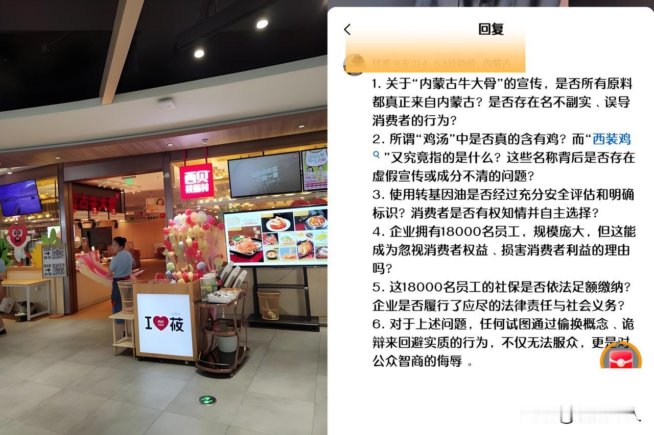 西贝,自从与老罗开撕后,公关不断 连吃瓜网友都看得疲劳、腻歪,不想再吐槽有一位网友直戳核心,向西贝发起了数连问→ 1.关于“内蒙古牛大骨”的宣传,是否所有原料 都真正来自内蒙古?是否存在名不副实、误导 消费者的行为? 2.所谓“鸡汤”中是否真的含有鸡?而“西装鸡 ”又究竟指的是什么?这些名称背后是否存在 虚假宣传或成分不清的问题? 3.使用转基因油是否经过充分安全评估和明确 标识?消费者是否有权知情并自主选择? 4.企业拥有18000名员工,规模庞大,但这能 成为忽视消费者权益、损害消费者利益的理由 吗? 5.对于上述问题,任何试图通过偷换概念、诡 辩来回避实质的行为,不仅无法服众,更是对 公众智商的侮辱。 这位网友在一位力挺西贝的博主下的留言,发出的这数连问,似乎每一个问题直接戳穿了西贝需要面对的问题。 消费者不关注你企业规模有多大,他们只关心产品本身是否符合性价比,关心吃进自己肚子里的东西是否能吃得安全、放心! (素材来源于网络)