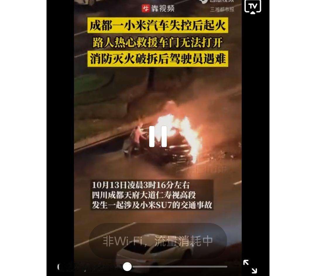 10月13日凌晨,一辆小米SU7在成都天府大道上燃起熊熊大火,车主疑似被困在车内