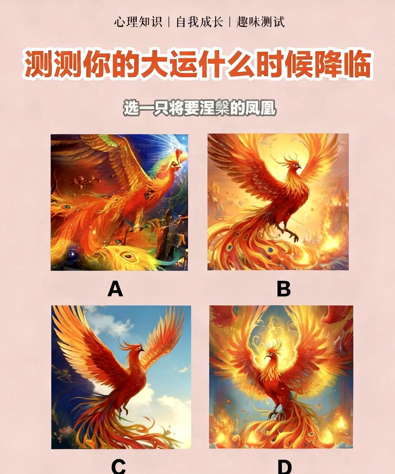 最近全网都在选凤凰? 三只用金红羽毛画的“涅槃凤凰”测试火了,评论区直接吵翻:有人拍着左边展翅的喊“爪子抓祥云,今年高低得翻身!”;有人蹲中间尾羽带金边的追问“这是要遇贵人?等不及看解析!”;还有人盯着右边眼神凶的硬扛:“怕遇坎儿?涅槃不就得熬过去嘛!” 老祖宗早把凤凰说透了:《山海经》叫“丹鸟”,说它“见则天下安宁”;《淮南子》写“五色而文,名曰凤皇”,红羽是红火,金纹藏贵气;《诗经·大雅》更唱“凤凰于飞,翙翙其羽”,象征吉祥和谐。 这鸟儿从先秦就是“瑞鸟”代名词,难怪大家盯着图挪不开眼。 心理老师说这叫“图像投射测验”,跟罗夏墨迹测验一个理——想冲事业的,眼里只有展翅的劲儿;盼日子稳当的,自然摸金边的暖;敢扛事的,偏选那只带锋芒的,说到底是心里藏着啥,就瞅着啥。 其实哪有啥天生大运? 选展翅的得真扑腾,等贵人的不如自己成贵人,熬坎儿的就得硬扛着飞。 你会点哪只? 评论区唠唠,权当给自己打打气——毕竟凤凰涅槃,从来不是选出来的,是飞出来的。