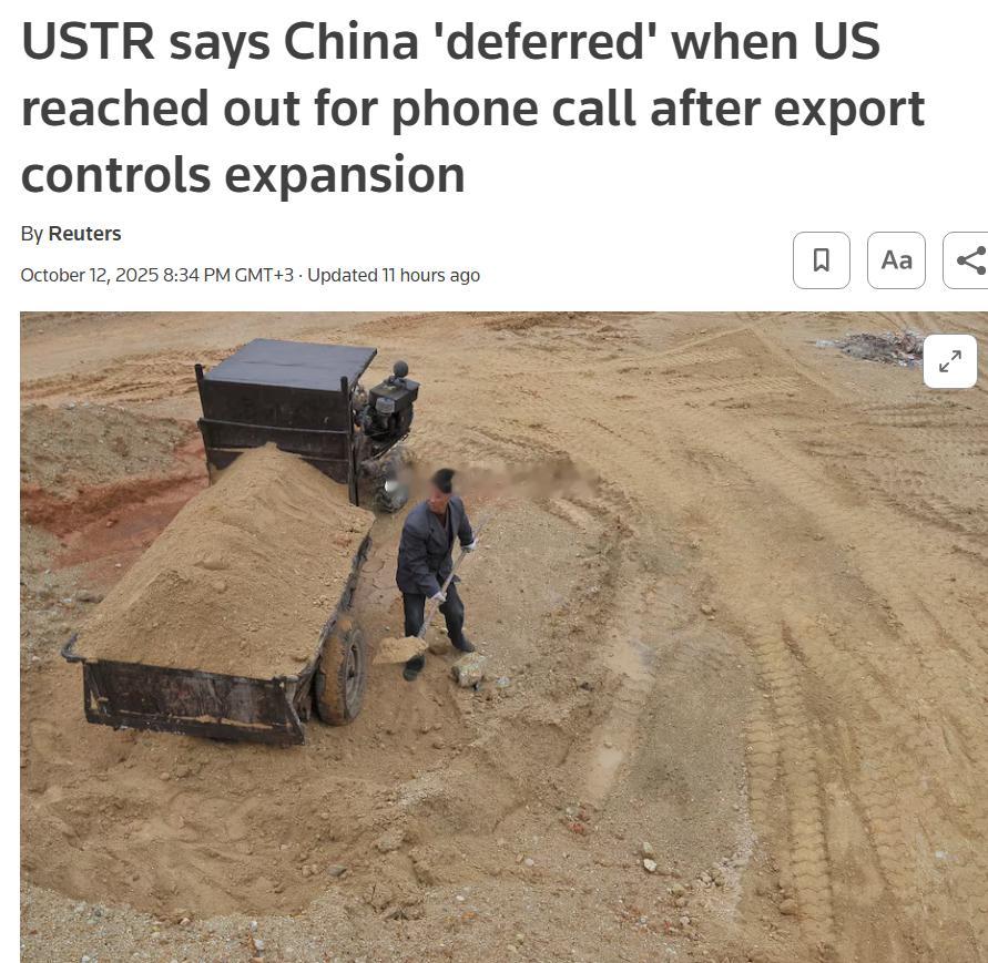 10月12日据路透社报道,美国贸易代表贾米森·格里尔(Jamieson Greer)表示,中国宣布扩大稀土出口管制前美国事前没有收到任何通知。我们从公开渠道得到消息就立即联系中方请求通话,但中方推迟了。中方这种所谓的“权力攫取”(power grab,意为夺权)行为令美方感到意外。