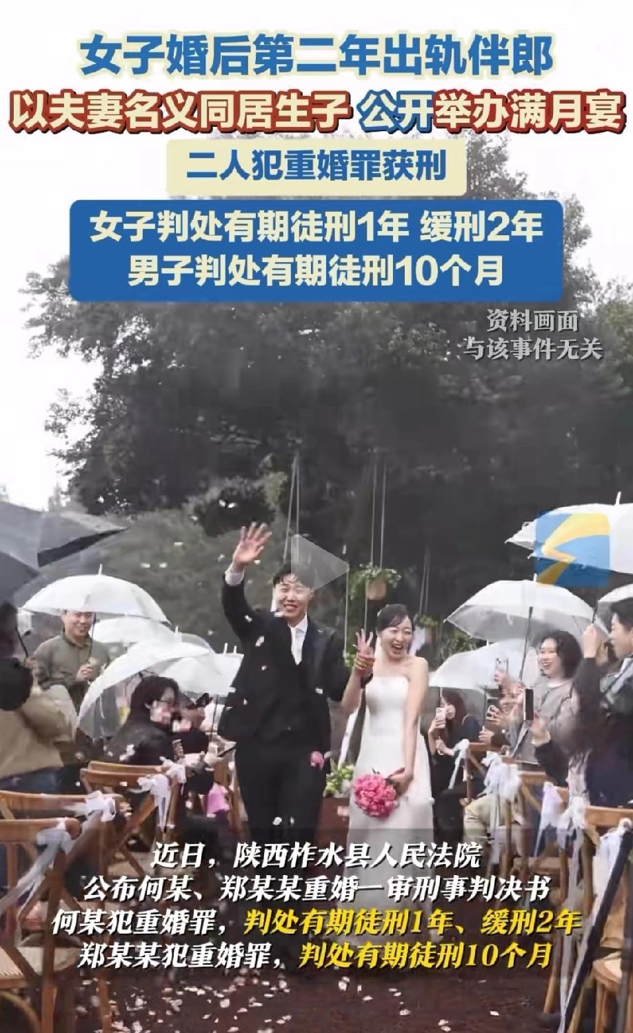 “这就是婚内出轨的下场!”陕西商洛,女子结婚后,因丈夫经常外出打工,她竟然和伴郎长期共同生活,还生育了一个儿子。更不可思议的是,女子分娩时,伴郎还以配偶的身份,在患者知情书上签字。孩子满月时,伴郎和女子还邀请亲朋好友大摆宴席。事件曝光后,女子和伴郎为此双双获刑。 何女士怎么也没想到,她只是一时糊涂,犯下了很多女人都会犯的错,最后会让两个人都蹲了监狱。 这事儿还得从她和丈夫程某的婚姻说起,2019年12月,何女士和程某领了结婚证,办婚礼的时候,郑某来当伴郎,当时谁也没把这三人的关系往别的地方想。 可婚后日子没过多久,程某为了多挣点钱养家糊口,就常年在外打工,家里经常只剩何女士一个人。 独守空房的日子久了,何女士心里渐渐觉得空落落的。 不知从什么时候起,她和之前认识的伴郎郑某联系越来越频繁,一来二去,两人竟然越界走到了一起。 2020年起,他们干脆不遮掩了,直接对外以夫妻的名义住到了一起,周围不知情的邻居,还真以为他俩是正经夫妻。 更离谱的是,2022年12月,何女士怀孕足月要生孩子,在医院办手续、签各种文件时,郑某竟堂而皇之地以配偶的身份签字。 从委托书到患者知情同意书,郑某全程没避着任何人,仿佛他才是何女士的合法丈夫。 孩子顺利出生后,2023年2月,何女士和郑某更是胆大包天,直接在当地一家饭店给孩子大办满月宴。 何女士的亲戚、郑某的父亲都来捧场,宴席办得热热闹闹,不知情的人还跟着恭喜他们喜得贵子。 亲朋好友们完全没意识到,这场满月宴背后藏着一段见不得光的关系,更没想着这是在给何女士的丈夫程某戴绿帽。 从同居到生孩子,何女士和孩子的生活费全是郑某掏的,郑某也俨然把自己当成了这个小家的男主人。 可他们没得意多久,意外就来了。 2023年3月,郑某因非法狩猎,被法院判了十个月有期徒刑,关进了监狱。这下,他和何女士的夫妻关系才被迫断了。 纸终究包不住火,郑某坐牢后,他和何女士的事儿也渐渐传开,最后传到了程某耳朵里。 程某得知自己不仅被妻子背叛,甚至妻子和别人生了孩子、大办满月宴,气得他浑身发抖,当即选择报警。 警方介入调查后,何女士和郑某知道躲不过去了,接到传唤就主动去了派出所,一五一十地交代了他们从2020年开始同居、生子的全部事实。 何女士在有合法配偶的情况下,仍与郑某以夫妻名义共同生活,郑某明知何女士已婚还这么做,两人的行为都涉嫌重婚罪,被依法提起公诉。 《刑法》第258条规定:有配偶而重婚的,或者明知他人有配偶而与之结婚的,处二年以下有期徒刑或者拘役。 何女士在与程某已登记结婚的前提下,自2020年起与郑某以夫妻名义共同生活,属于有配偶而重婚。 郑某明知何女士已婚,仍与其以夫妻名义同居、生育子女,属于明知他人有配偶而与之结婚,二者主观上均具备重婚的故意。 郑某以配偶身份在何女士分娩时签署医疗文件,二人共同举办孩子满月宴并邀请双方亲属参加,郑某长期承担何女士母子的生活费用,这些行为已经构成事实重婚,依法应追究刑事责任。 检察机关认为,何女士和郑某都能认罪认罚,而且有自首情节,建议从轻处罚,并适用缓刑。 《刑法》第67条规定:犯罪以后自动投案,如实供述自己的罪行的,是自首。对于自首的犯罪分子,可以从轻或者减轻处罚。其中,犯罪较轻的,可以免除处罚。 何女士与郑某在警方传唤后主动到案,并一五一十地交代了从2020年开始同居、生子的全部事实,完全符合自动投案的自首构成要件。 《刑事诉讼法》第15条规定:犯罪嫌疑人、被告人自愿如实供述自己的罪行,承认指控的犯罪事实,愿意接受处罚的,可以依法从宽处理。 何女士与郑某均自愿认罪认罚,这是二人获得从宽处罚的共同前提,但最终量刑如何还要法院具体判决。 郑某此前因非法狩猎罪被判处有期徒刑,属于有犯罪前科,根据量刑规则,前科情节会体现对行为人的主观恶性和再犯风险的评价。 同时,社区矫正机构不同意对郑某进行社区矫正,法院认为郑某不适合缓刑。 综上,法院依法作出判决,因重婚罪判处何女士有期徒刑1年,缓刑2年;判处郑某有期徒刑10个月,不适用缓刑。 郑某和和女士怎么也想不到,只是因为出轨就被判了刑,原本荒唐的幸福,终究落了个鸡飞蛋打的下场。