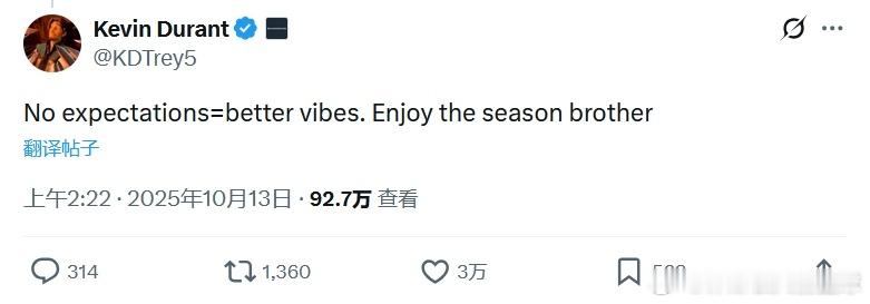 杜兰特回复道:“没有期待=更好的氛围。享受这个赛季吧兄弟。”