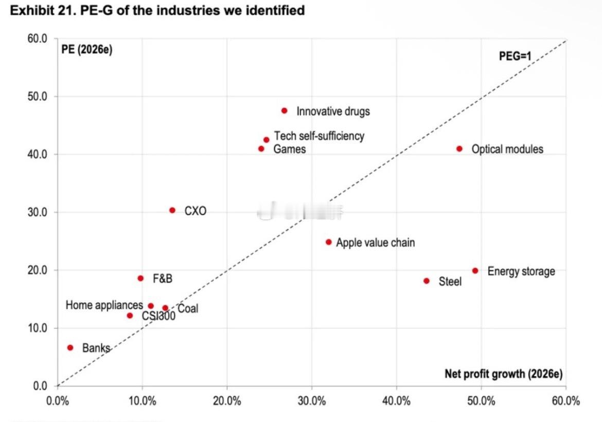 通过PEG估值法(即市盈率与盈利增长预期的比率)进行衡量,中国不同成长性行业的估值已出现显著分化。根据对2026年的业绩预测,光模块、苹果产业链和储能等板块虽然市盈率(PE)偏高,但其强劲的净利润增长预期使其PEG值低于1,甚至低于沪深300指数的1.43,这表明其高估值被未来的高增长所支撑,相对并不昂贵。相比之下,创新药、科技自立等主题的PEG则高于1,估值泡沫化风险更高。