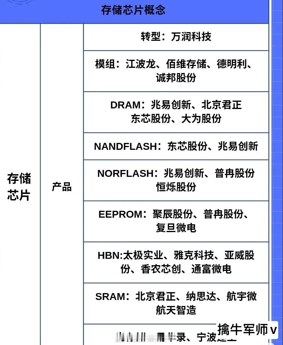 以产品类型为维度,详细罗列了中国在各类存储芯片领域的主要公司,如转型(万润科技)、模组(江波龙、佰维存储等)、DRAM(兆易创新、北京君正等)、NANDFLASH(东芯股份、兆易创新)、NORFLASH(兆易创新、普冉股份等)、EEPROM(聚辰股份、普冉股份等)、HBN(太极实业、雅克科技等)、SRAM(北京君正、纳思达等)及光存储(易华录、宁波建工)。
