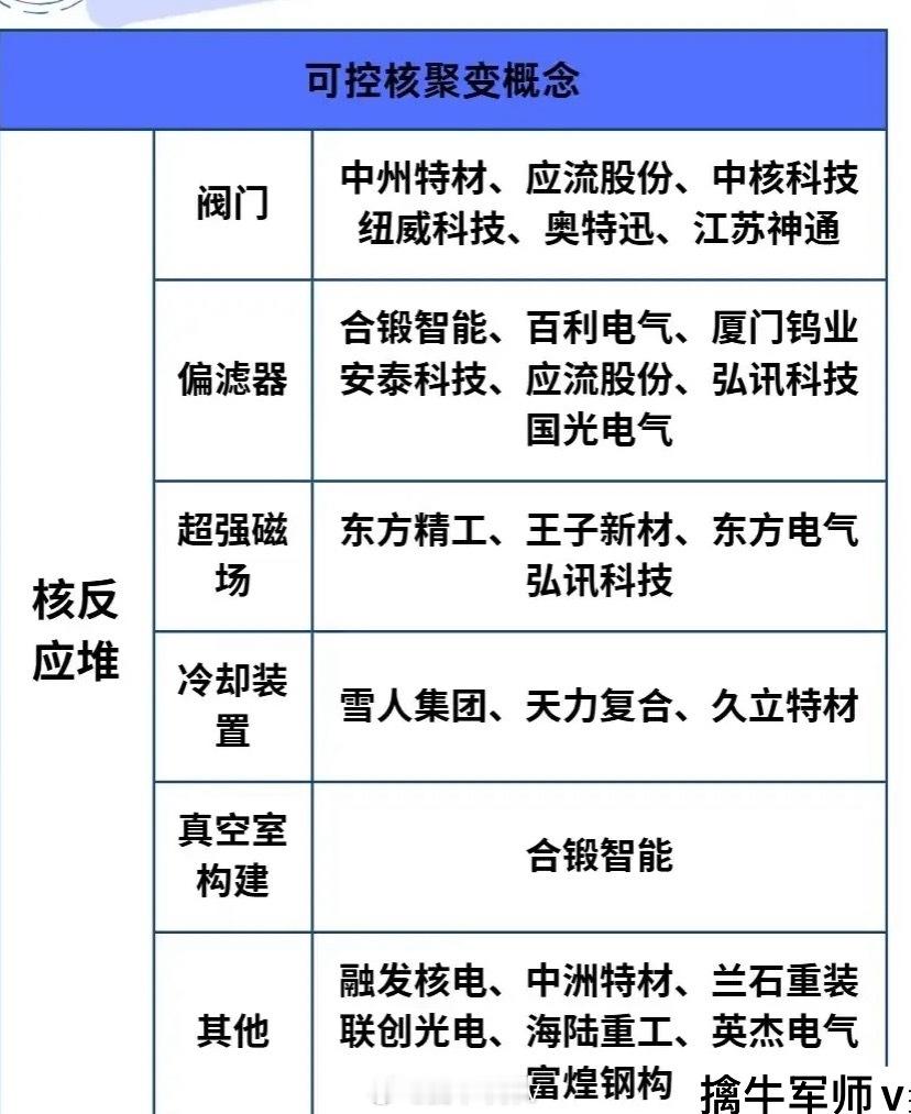 以核反应堆为核心,分类列举了相关设备/技术领域的公司,如阀门类(中州特材、应流股份等)、偏滤器(合锻智能、百利电气等)、超强磁场(东方精工、王子新材等)、冷却装置(雪人集团、天力复合等)、真空室构建(合锻智能)及其他(融发核电、富煌钢构等)。