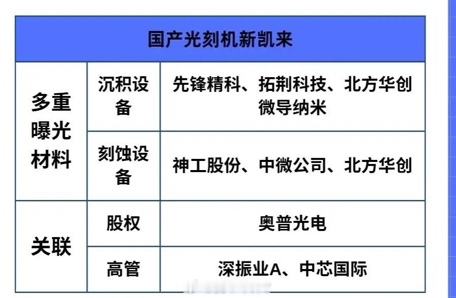 围绕新凯来,补充了多重曝光材料下的沉积设备和刻蚀设备相关公司(如先锋精科、神工股份等),并提及与新凯来有关联的企业,包括股权相关的奥普光电,以及高管相关的深振业A和中芯国际。