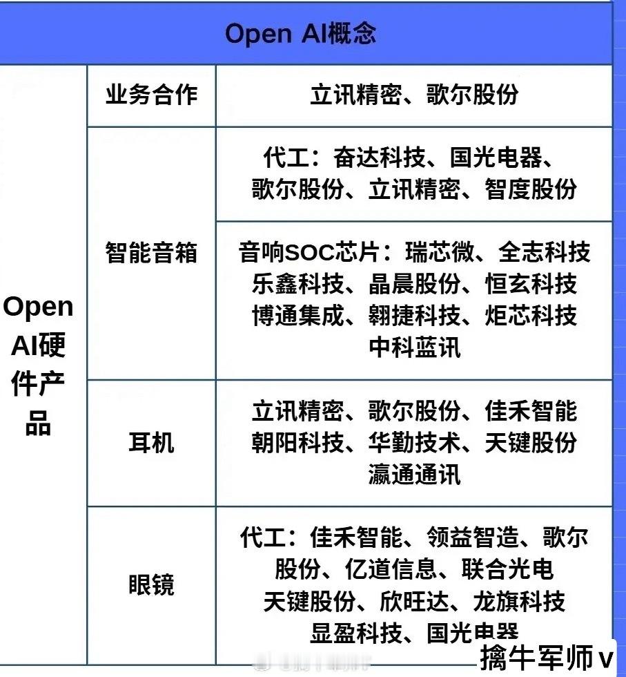 “Open AI概念”,列举了与Open AI硬件产品相关的企业,分类包括业务合作(如立讯精密、歌尔股份)、智能音箱(代工:奋达科技、歌尔股份等;音响SOC芯片:瑞芯微、全志科技等)、耳机(立讯精密、歌尔股份等)和眼镜(代工:佳禾智能、歌尔股份等;显盈科技等),涉及硬件制造、芯片方案、代工及声学组件等多个环节。