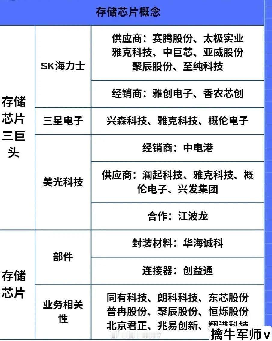 介绍全球存储芯片三巨头(SK海力士、三星电子、美光科技),分别列出它们的供应商、经销商及合作伙伴,随后归纳了与存储芯片相关的国内企业,包括封装材料、连接器及业务相关性企业(如同有科技、朗科科技等)。