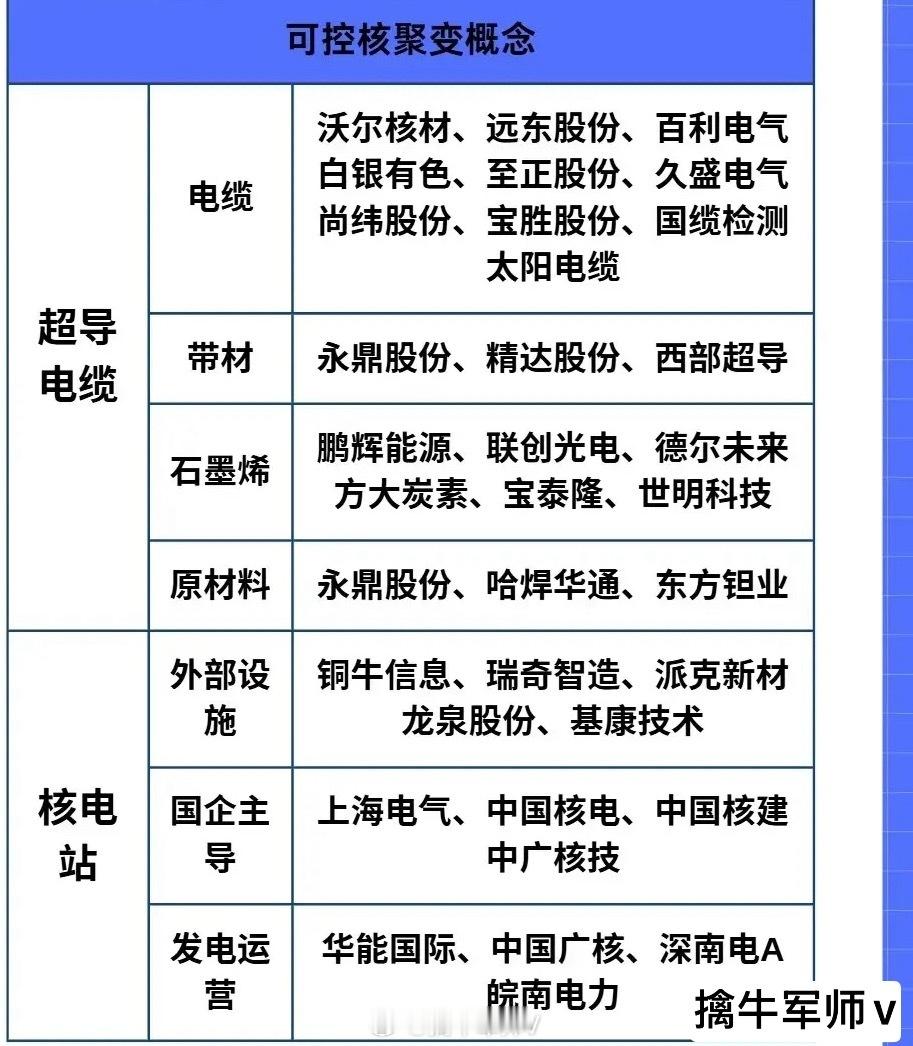 从超导电缆和核电站两个板块细分,超导电缆下分电缆、带材、石墨烯和原材料,列举沃尔核材、永鼎股份等公司;核电站下分外部设施、国企主导和发电运营,包含铜牛信息、上海电气、华能国际等企业。